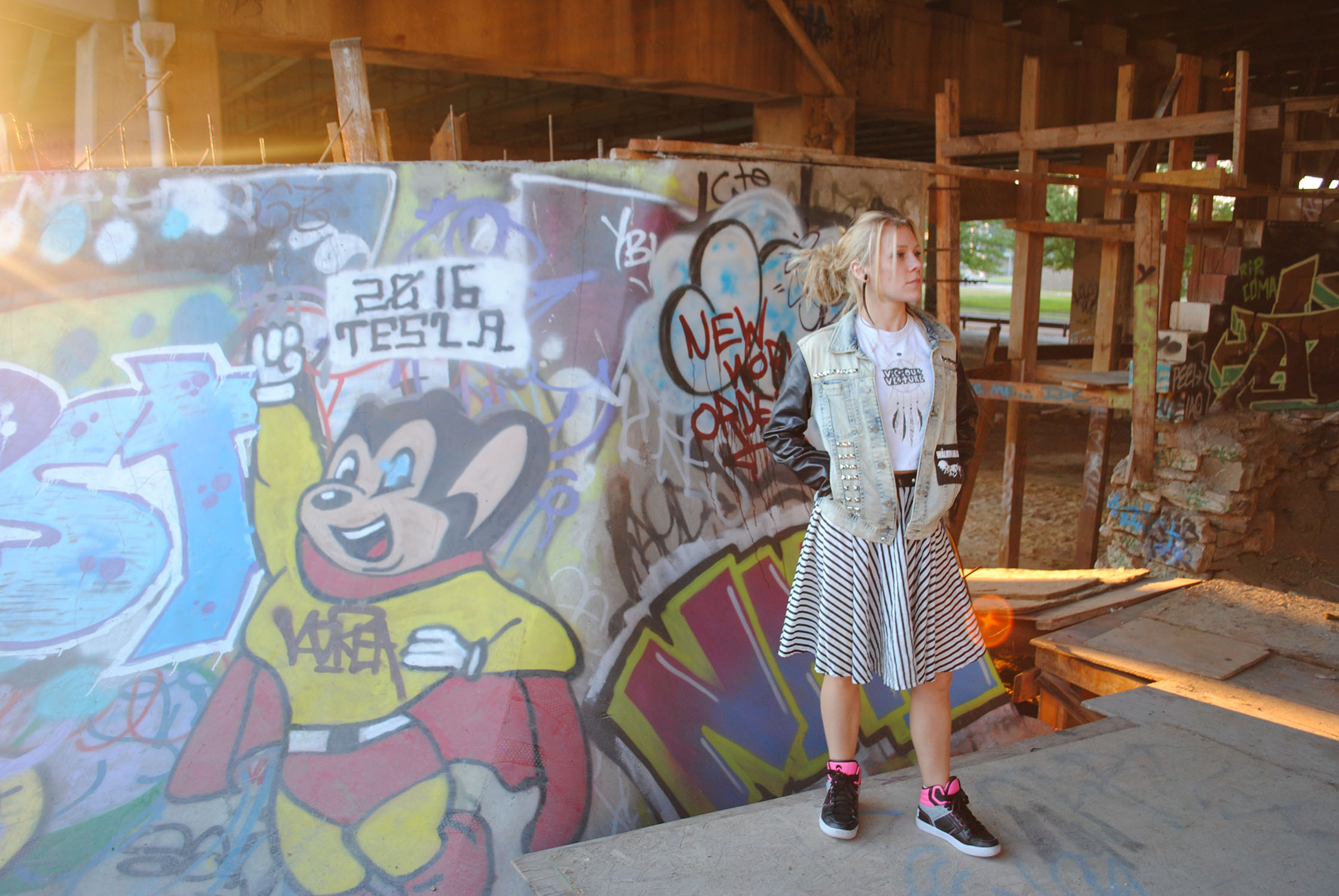 This hand-made,one-of-a-kind, upcycled denim jacket features leather sleeves and studs down the front, and a biker patch on the back.