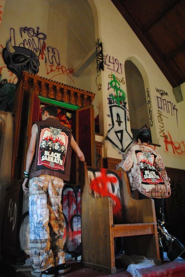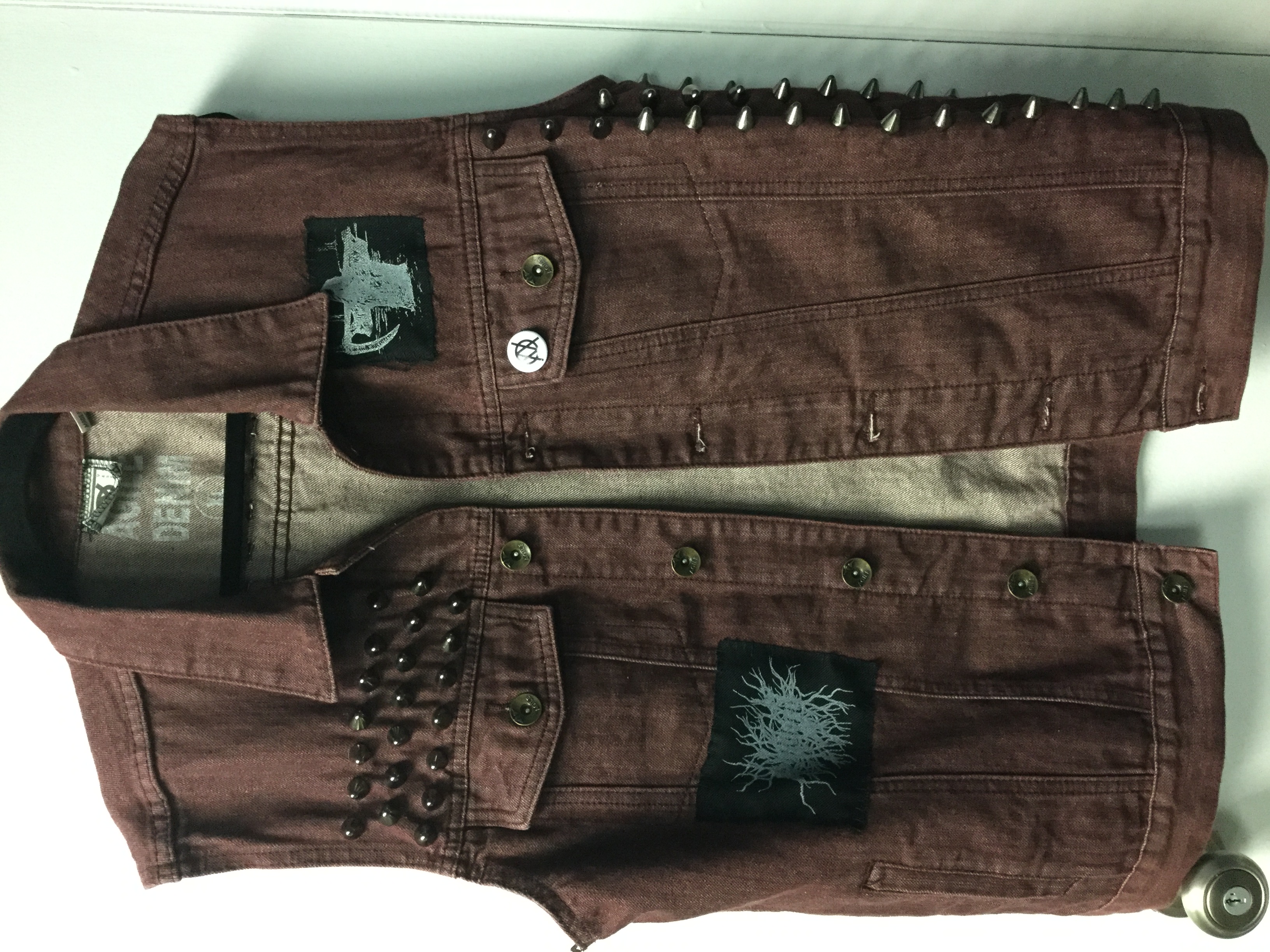 Hand-made, one-of-a-kind red denim vest featuring side spikes front patches and OBEY Black Sabbath back patch SIZE XL