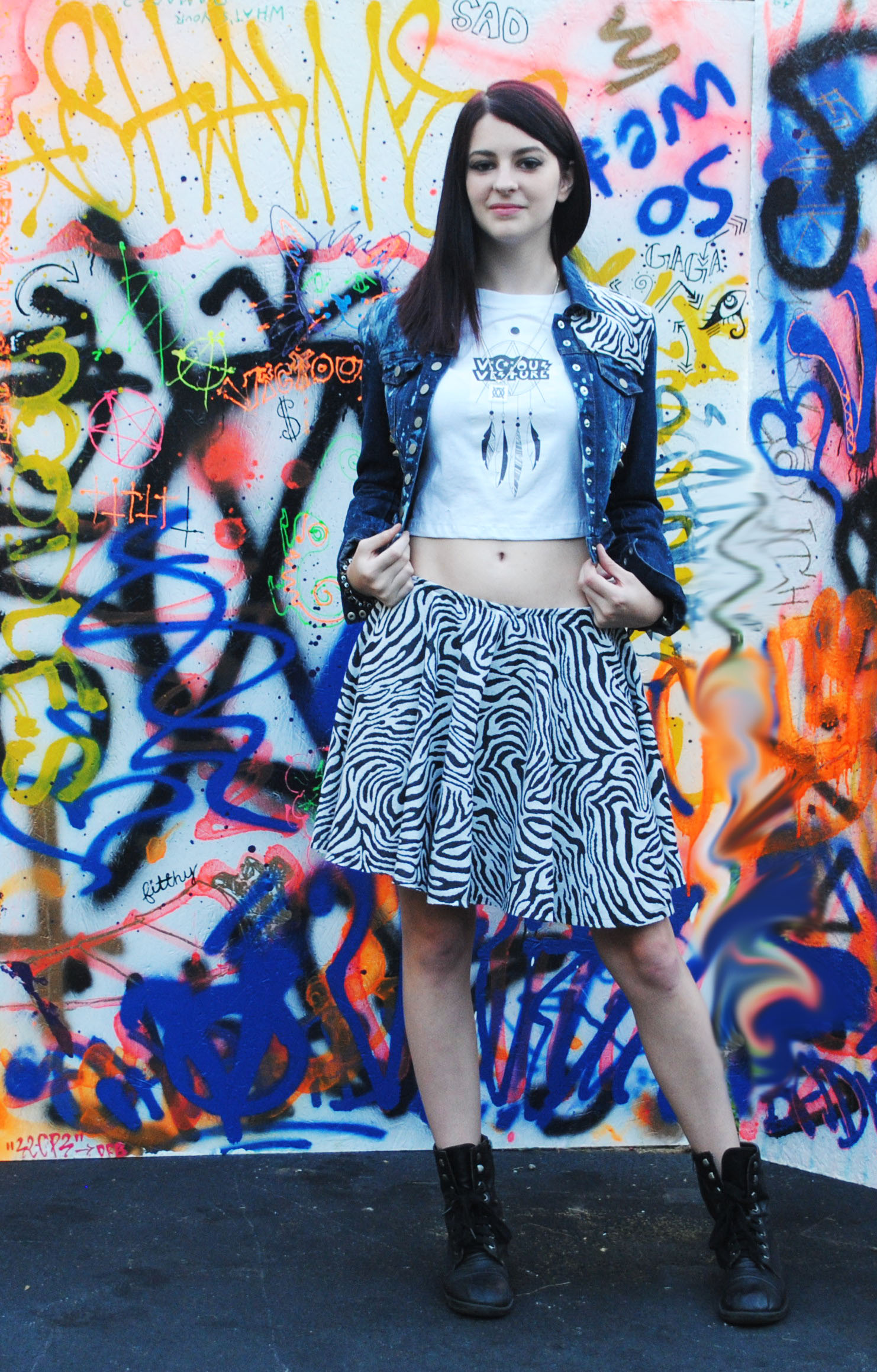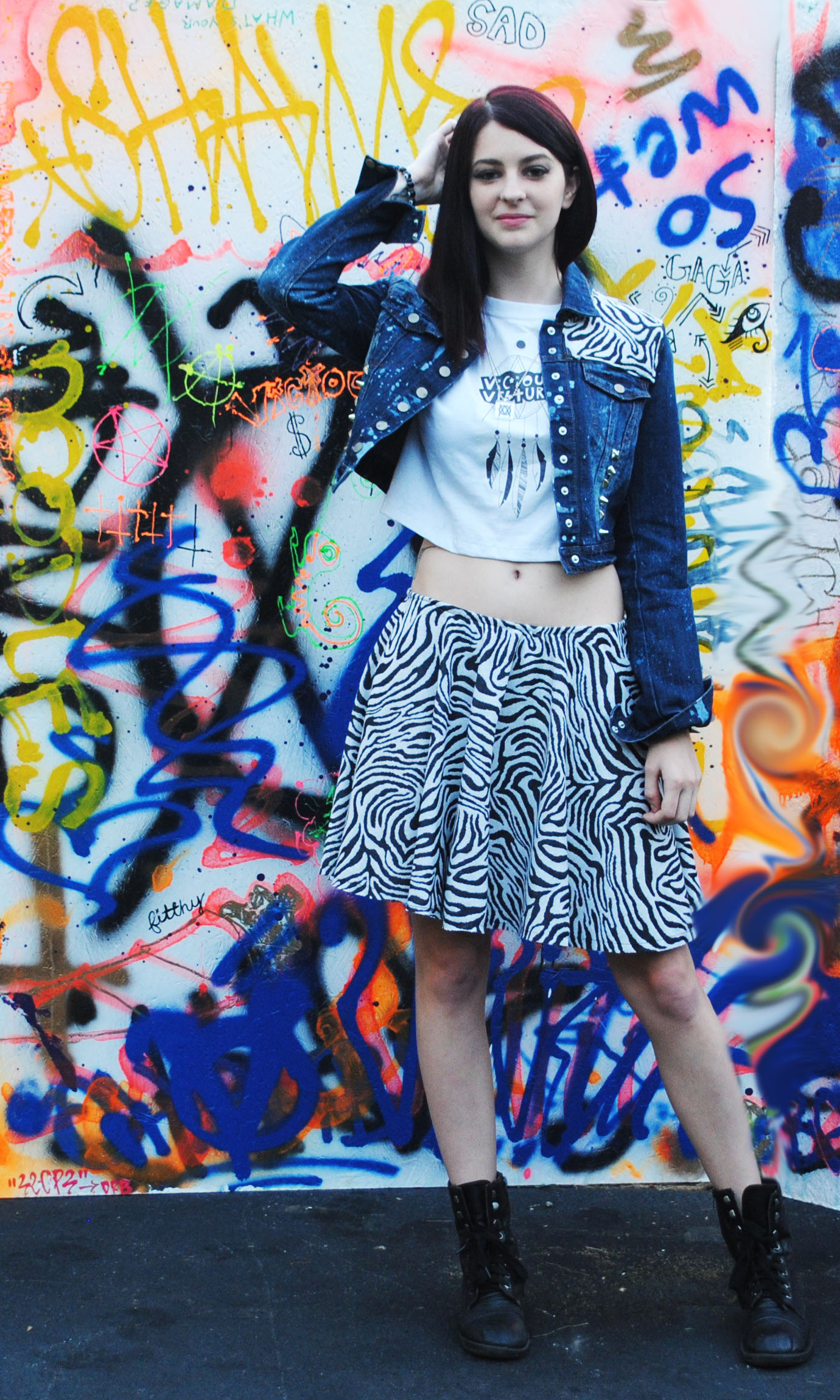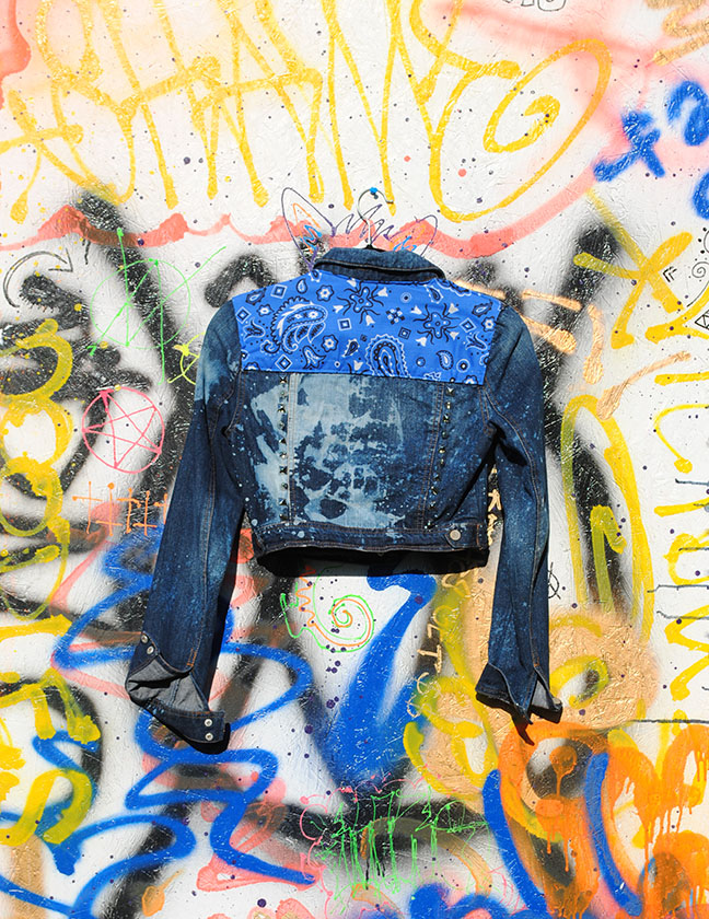 This one-of-a-kind & rocked-out cropped jacket was splattered with bleach and features a zebra & a paisley print patch as well as studs and spikes on the front and back.