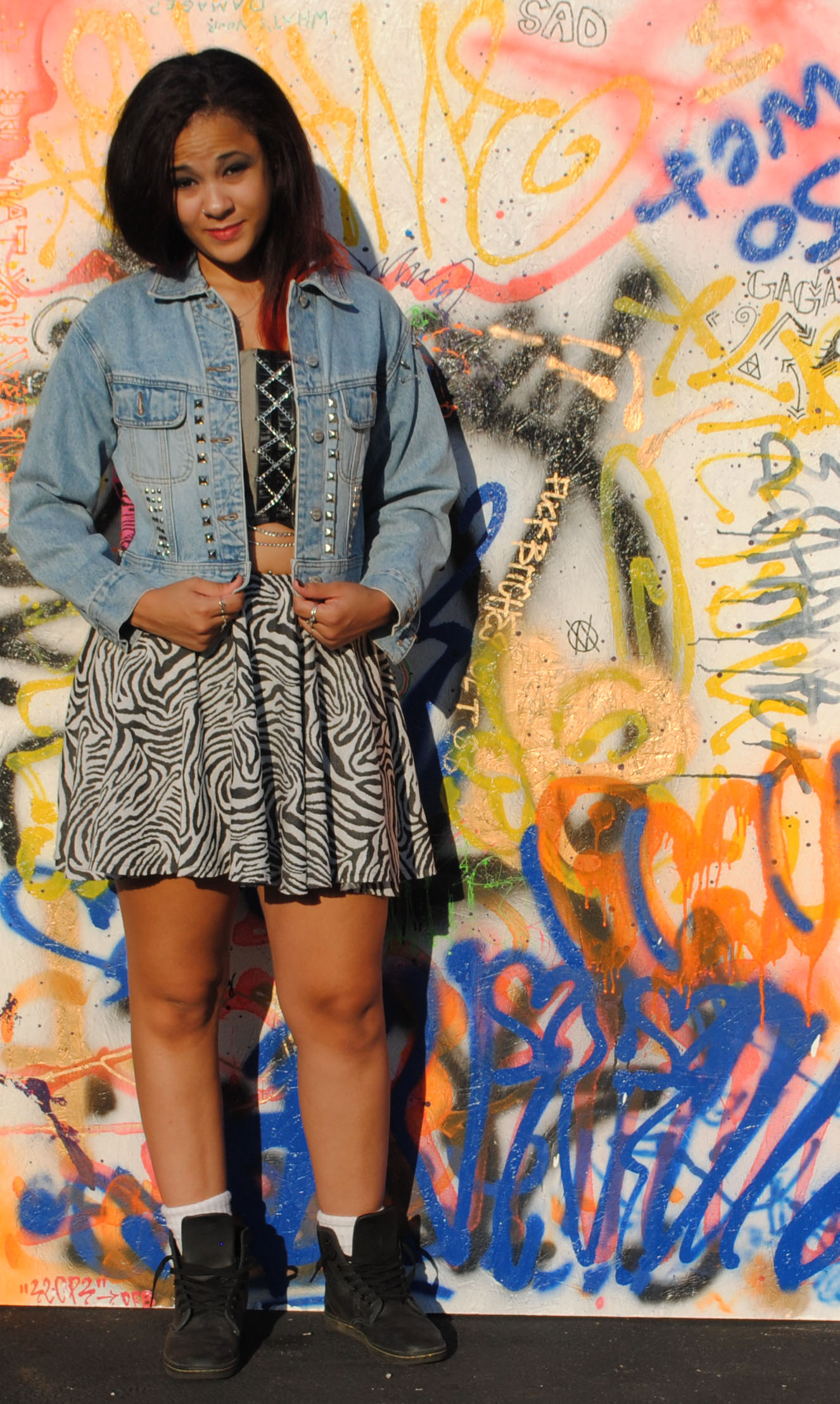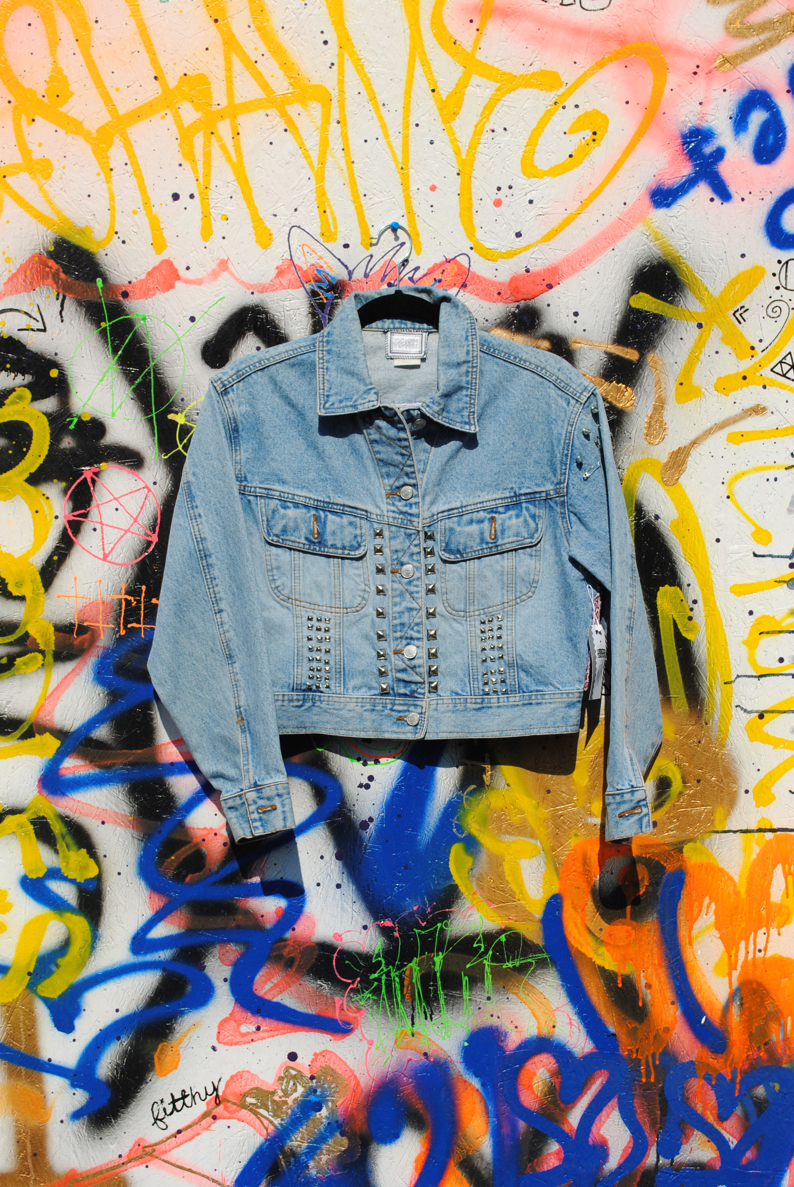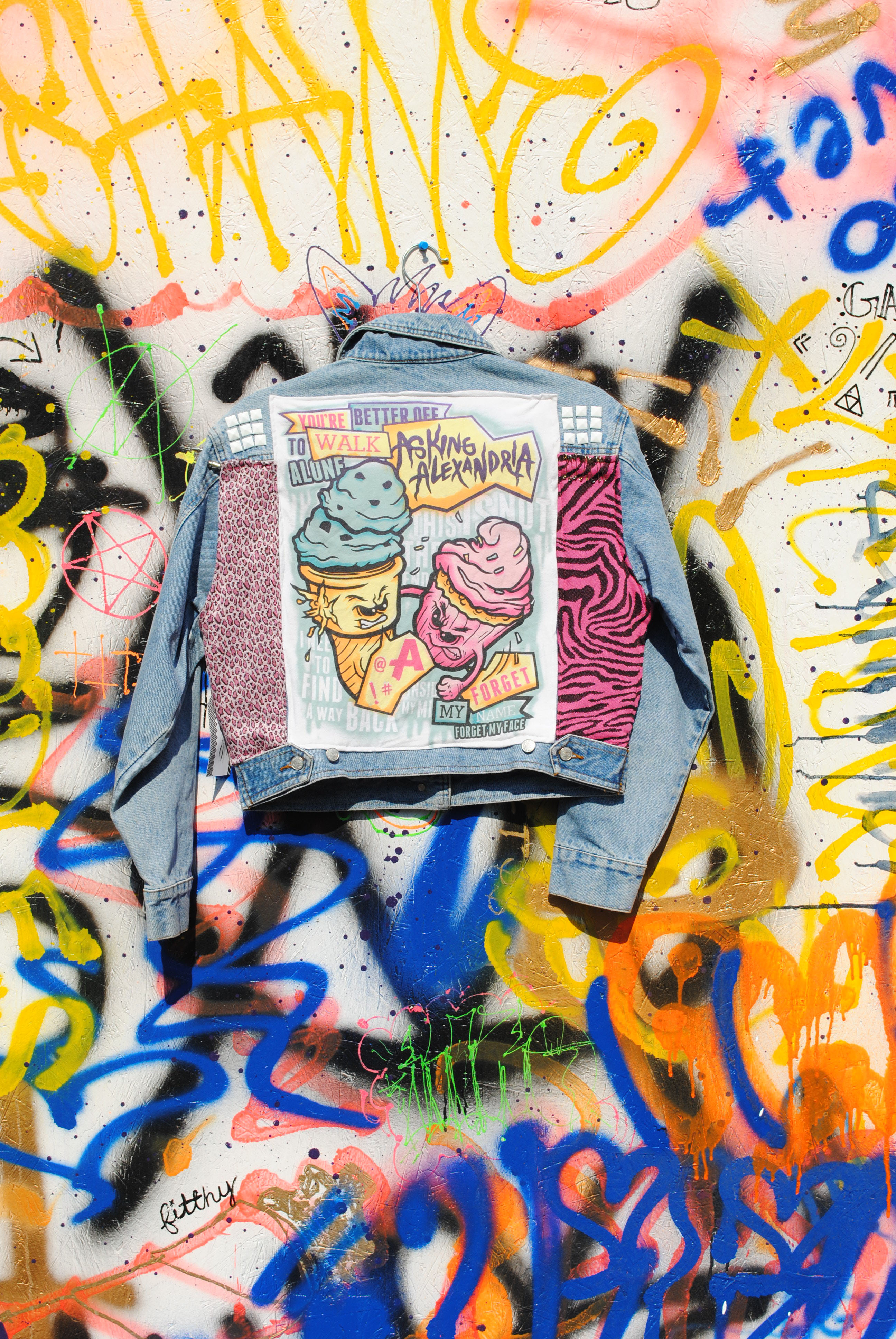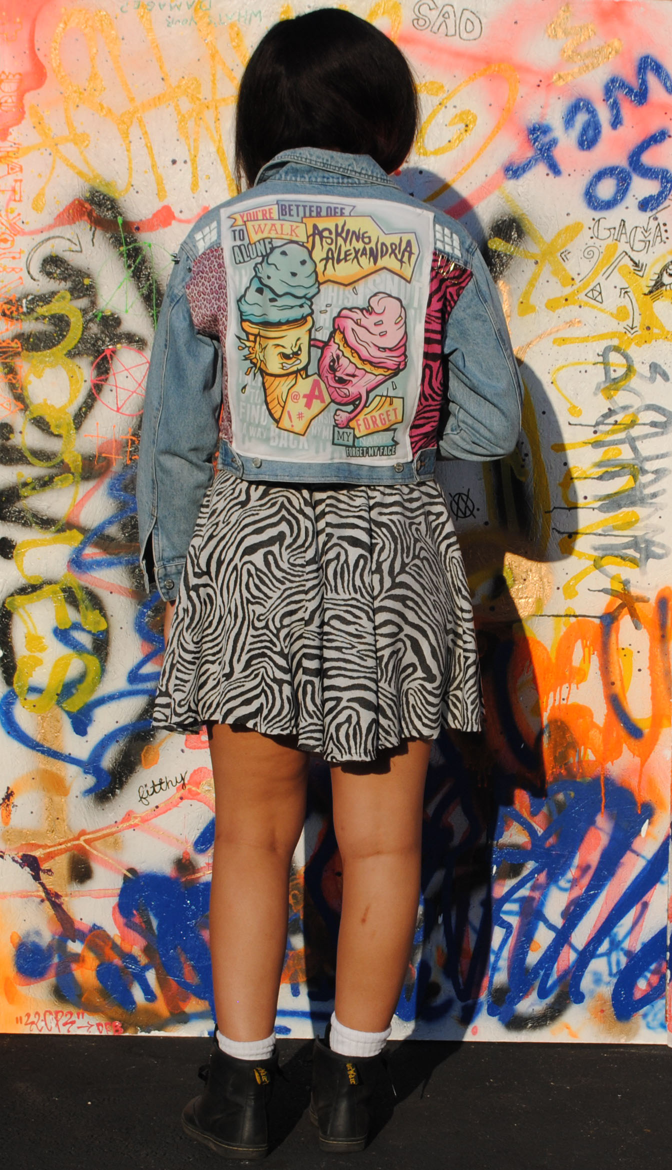 This hand-made, one-of-a-kind, up-cycled denim jacket features metal pyramid studs on the front with room for custom pins patches to be added. The back features an Asking Alexandria cupcake & ice cream graphic back-patch, as well as pink cheetah & zebra patches, white metal pyramid studs and safety pins. Sleeves feature a metal spiked shoulder and safety pins.