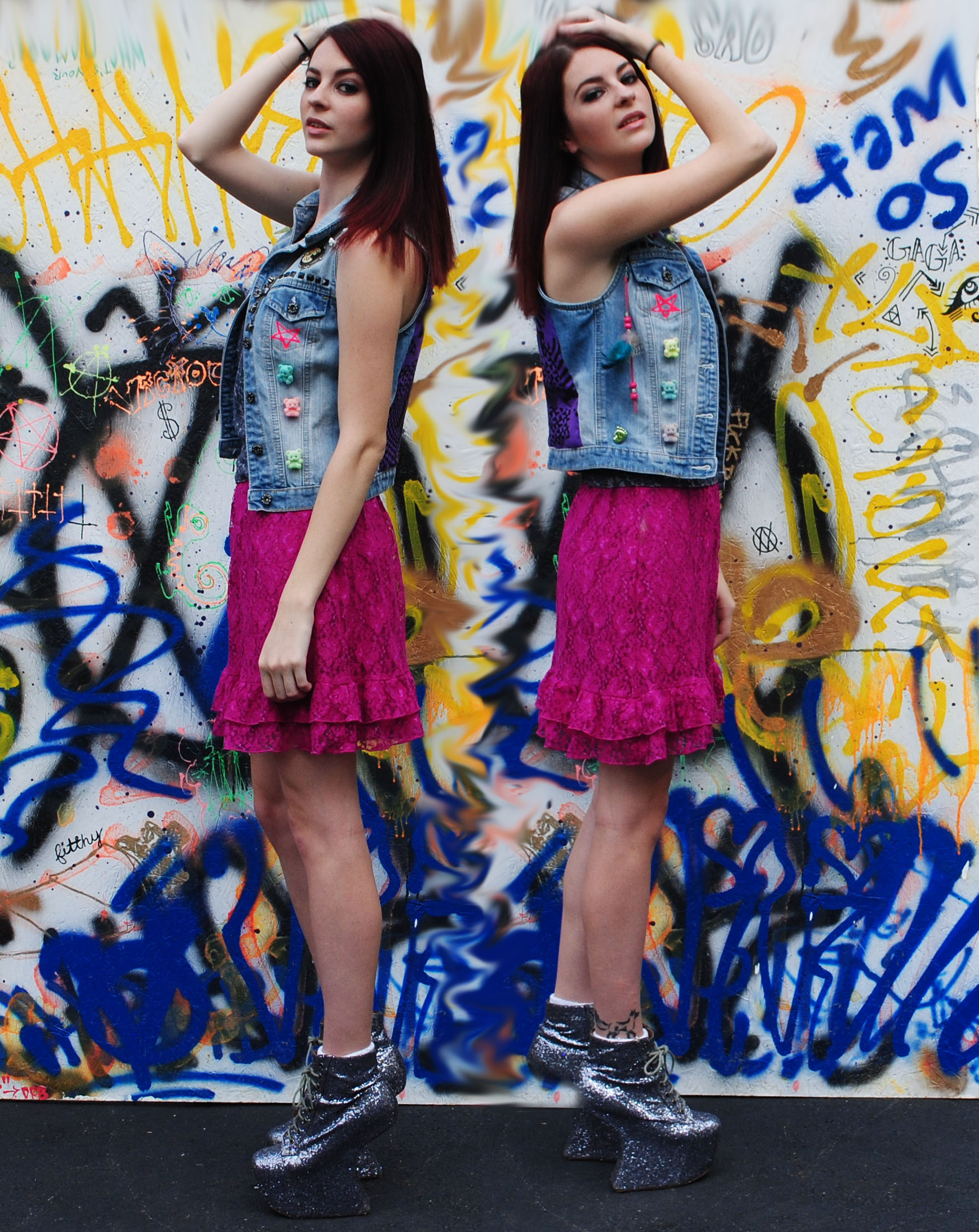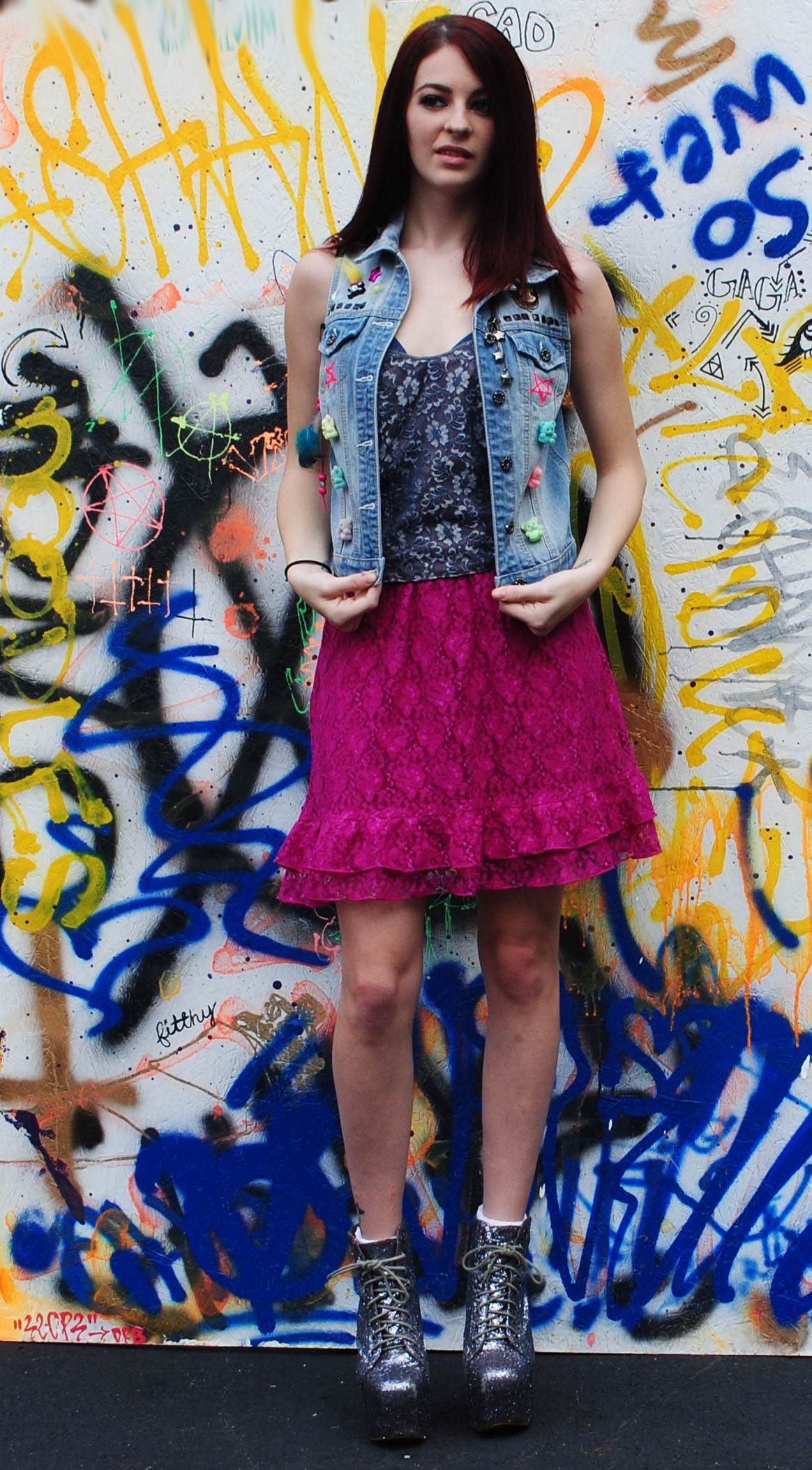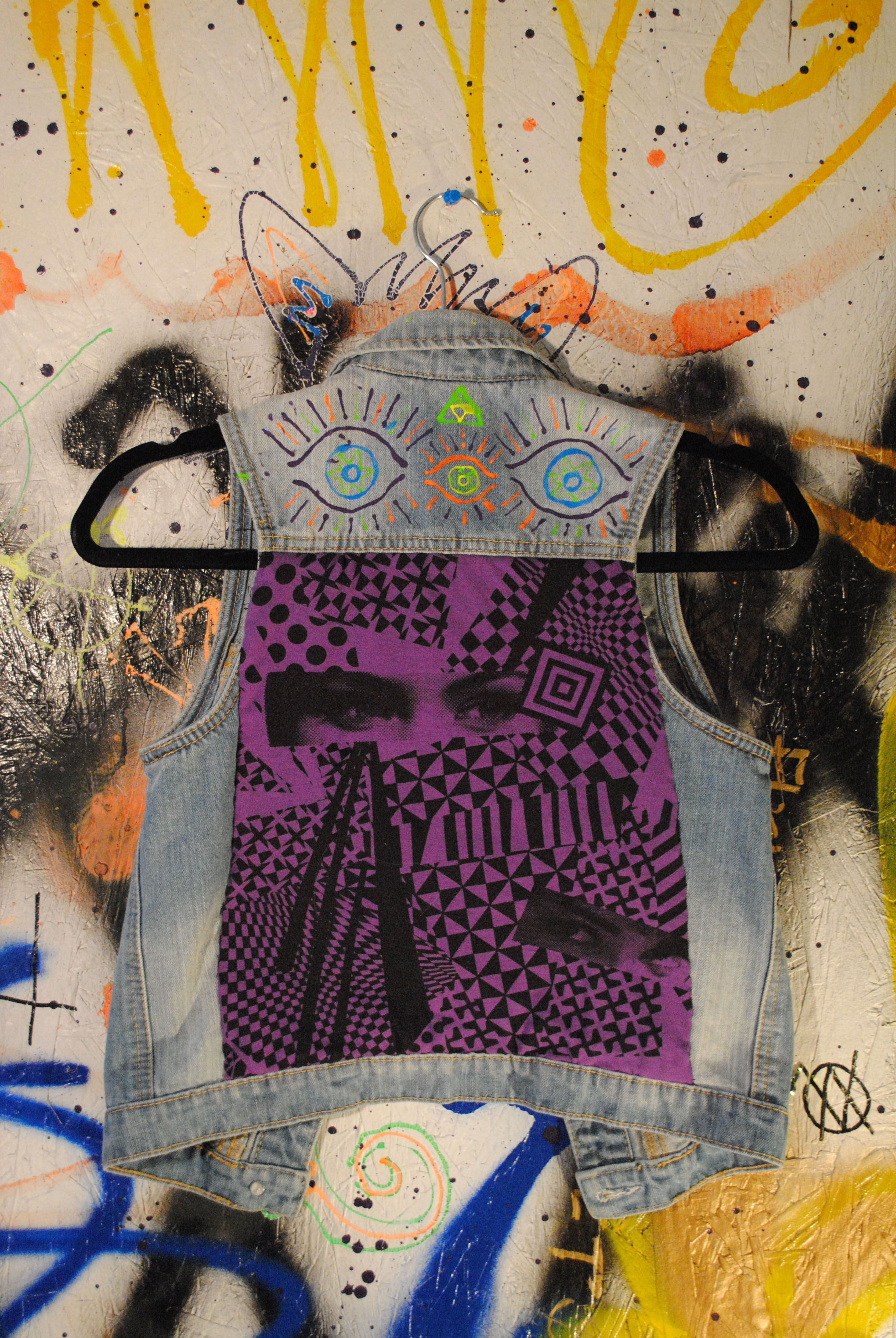 This hand-made, one-of-a-kind, up-cycled denim vest features a bunch of different knick-knacks and treasures. Troll dolls, fake skeleton cameos, little bears, and all seeing eyes. The back features a Zumiez back patch and hand painted all seeing eyes.