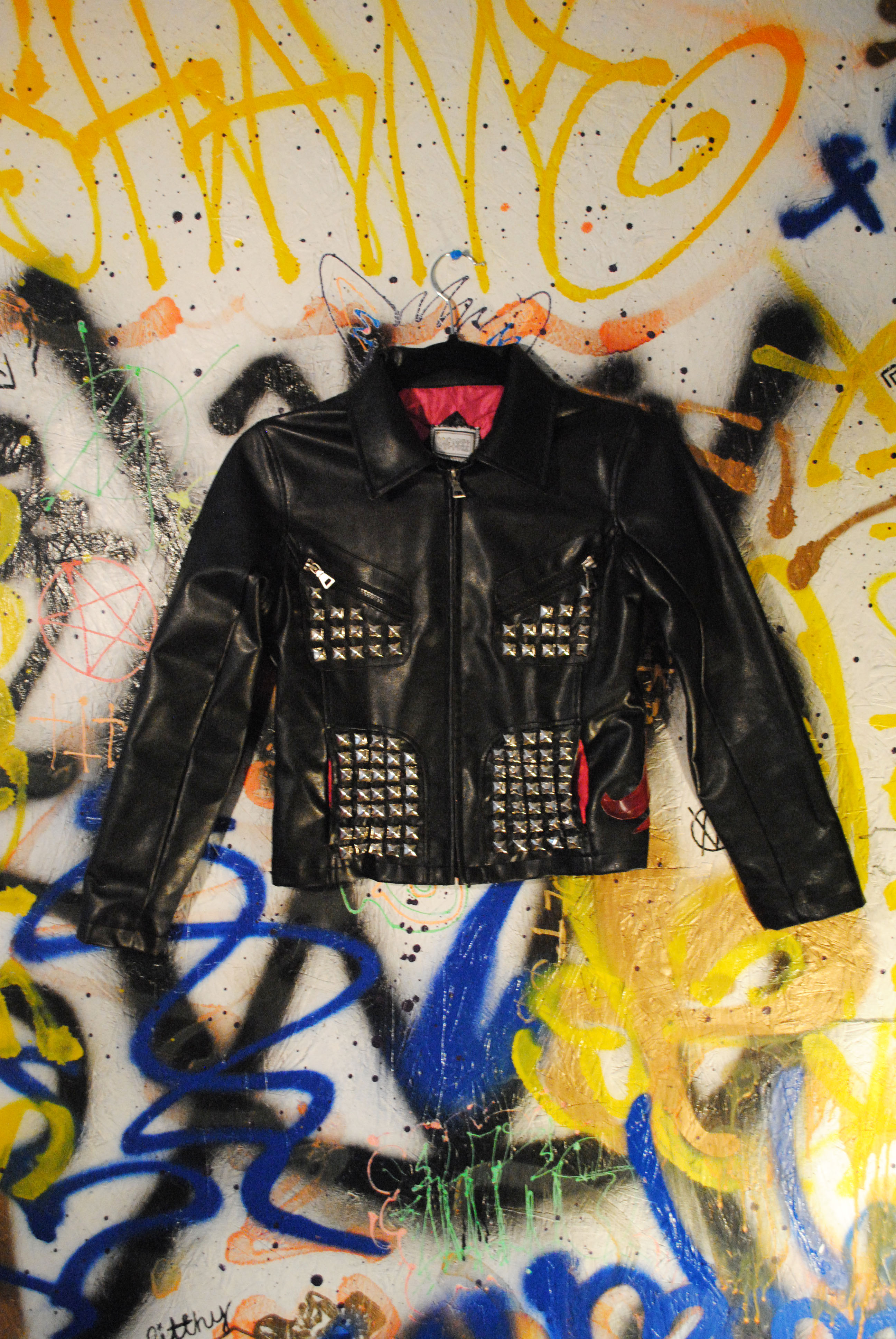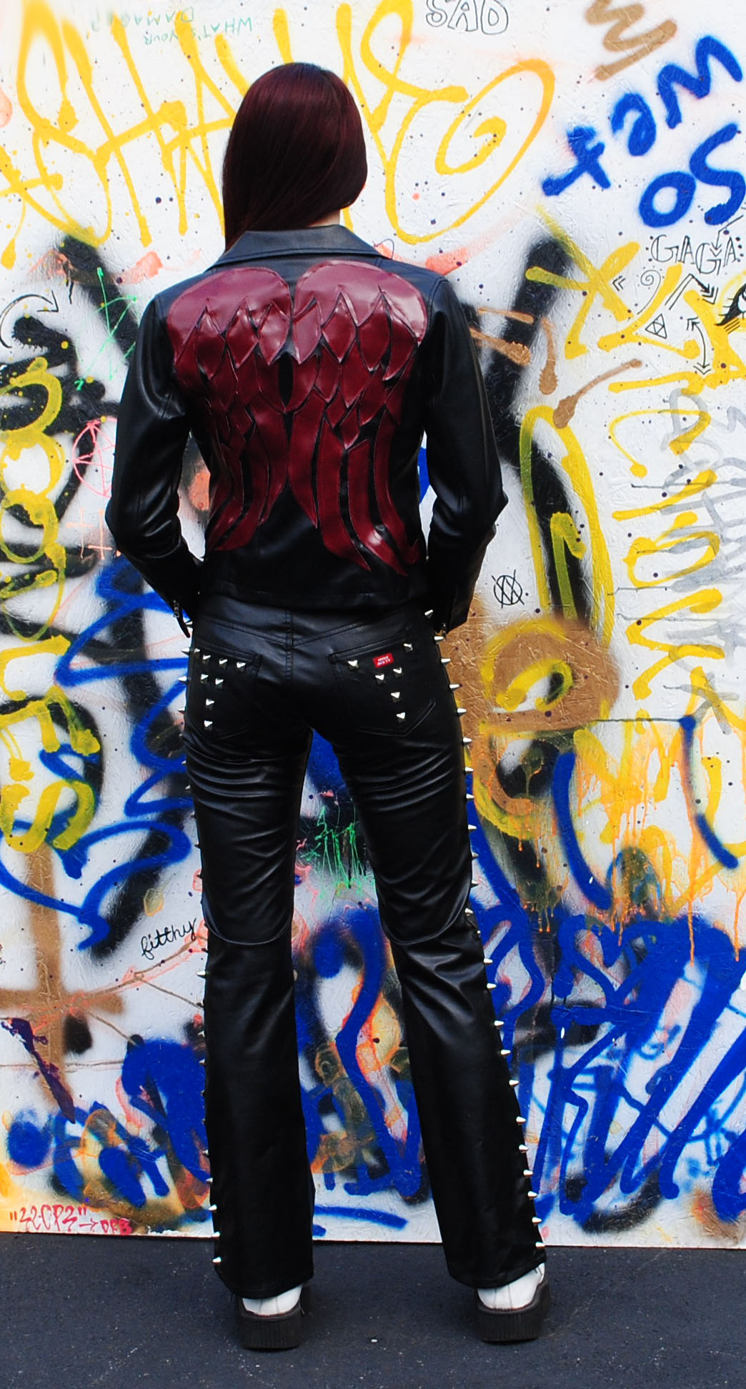 This hand-made, one-of-a-kind, up-cycled faux leather jacket features studded pockets on the front and on the back their are faux-leather Angel Wings inspired by Daryl Dixon's vest from The Walking Dead.