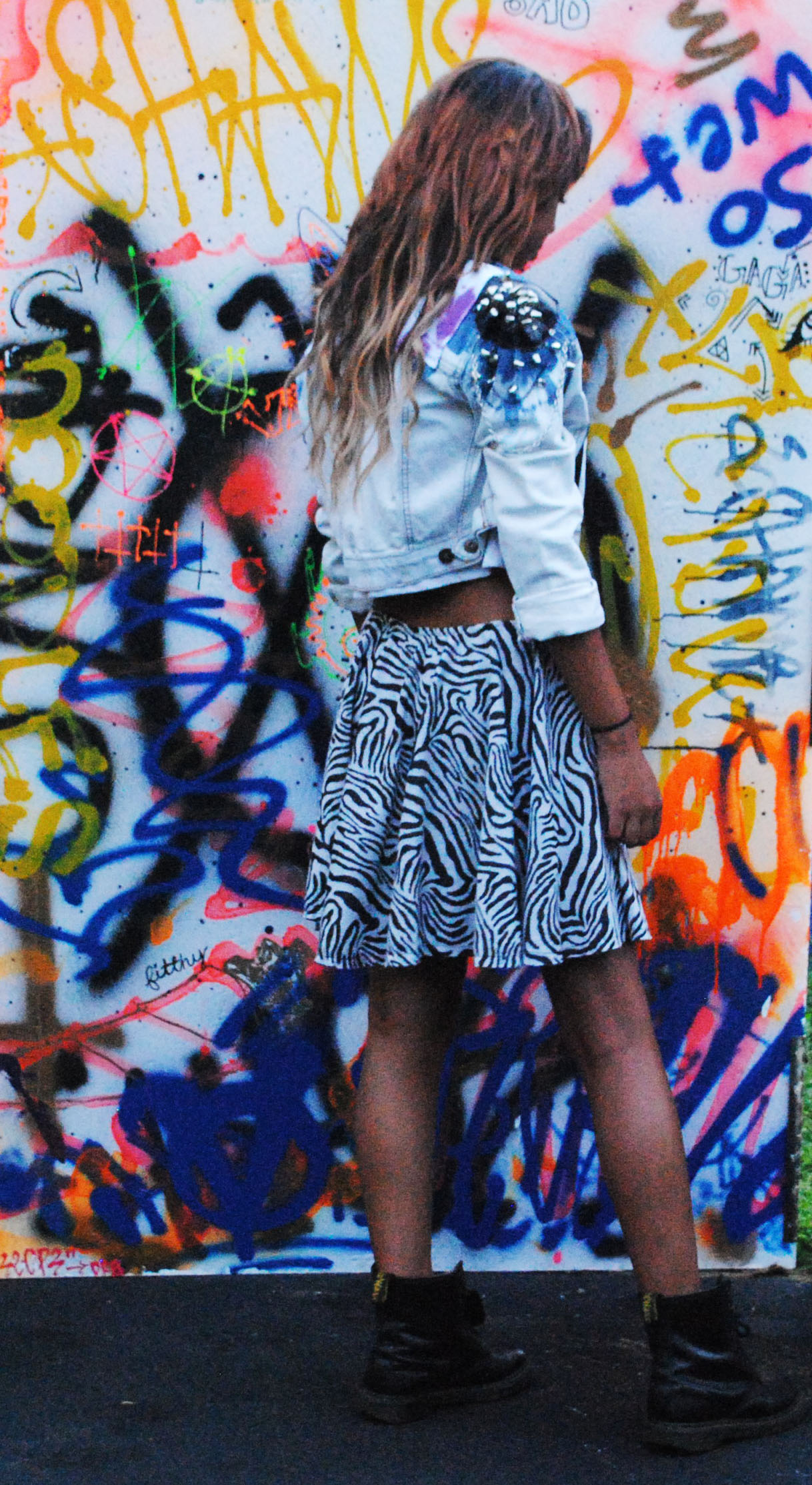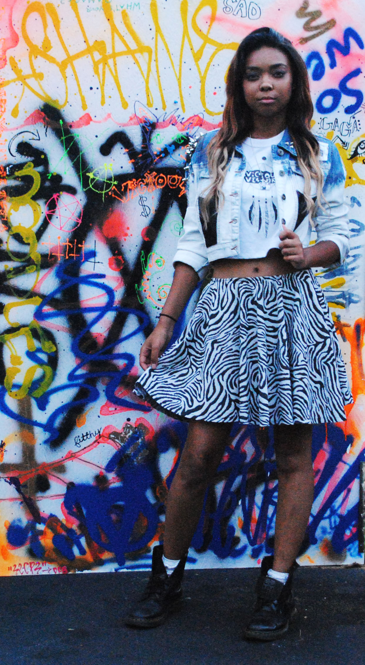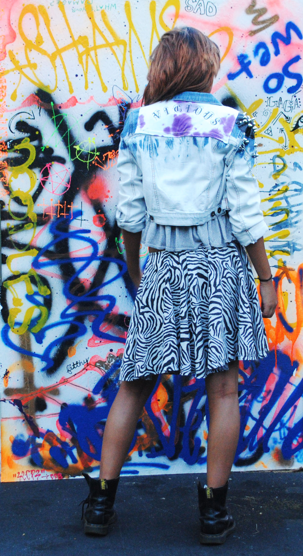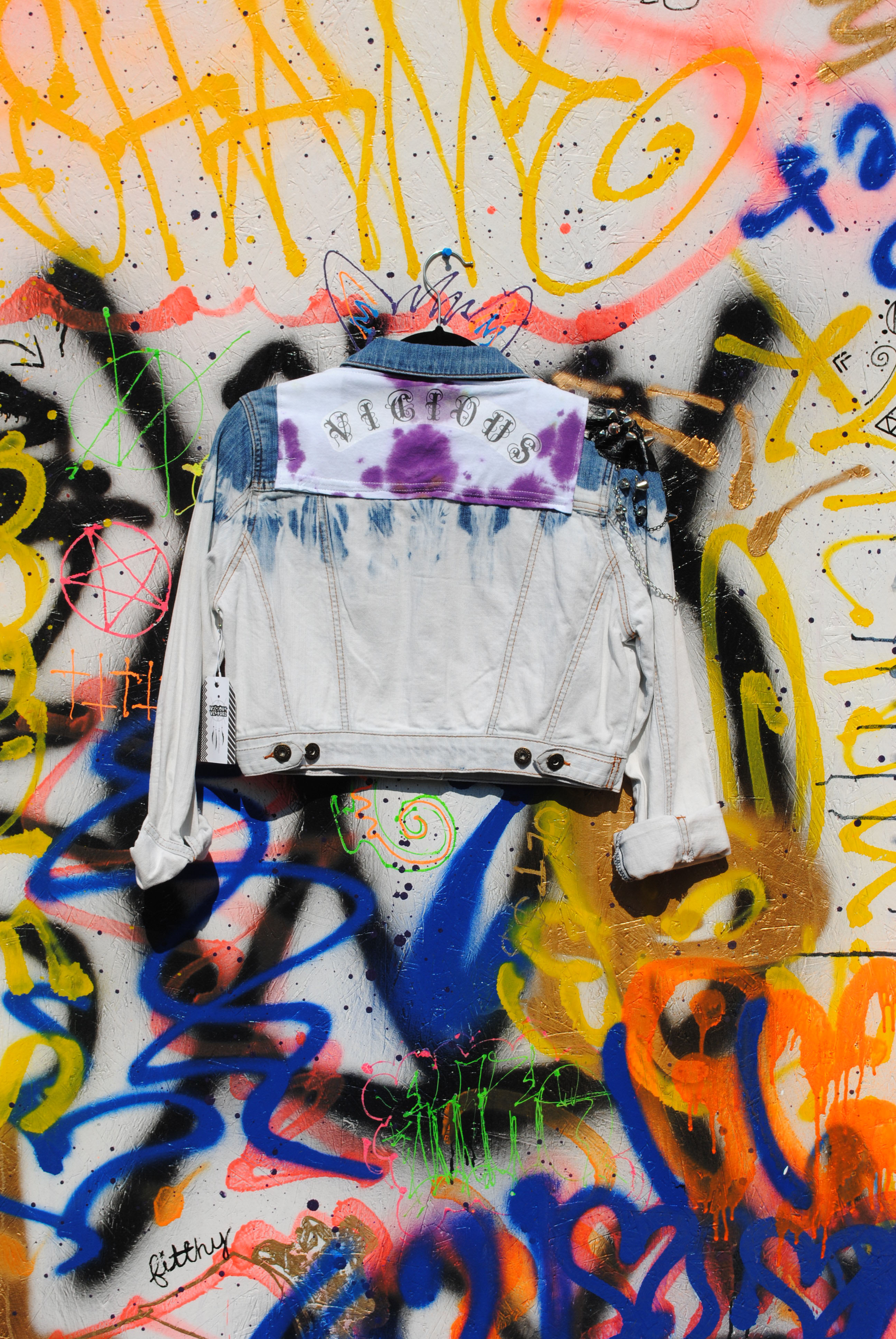 This one-of-a-kind & rocked-out cropped jacket has one spikey, mood designer leather, shoulder pad and a sex pistols and tie-dyed patch with the word "VICIOUS" across the back.