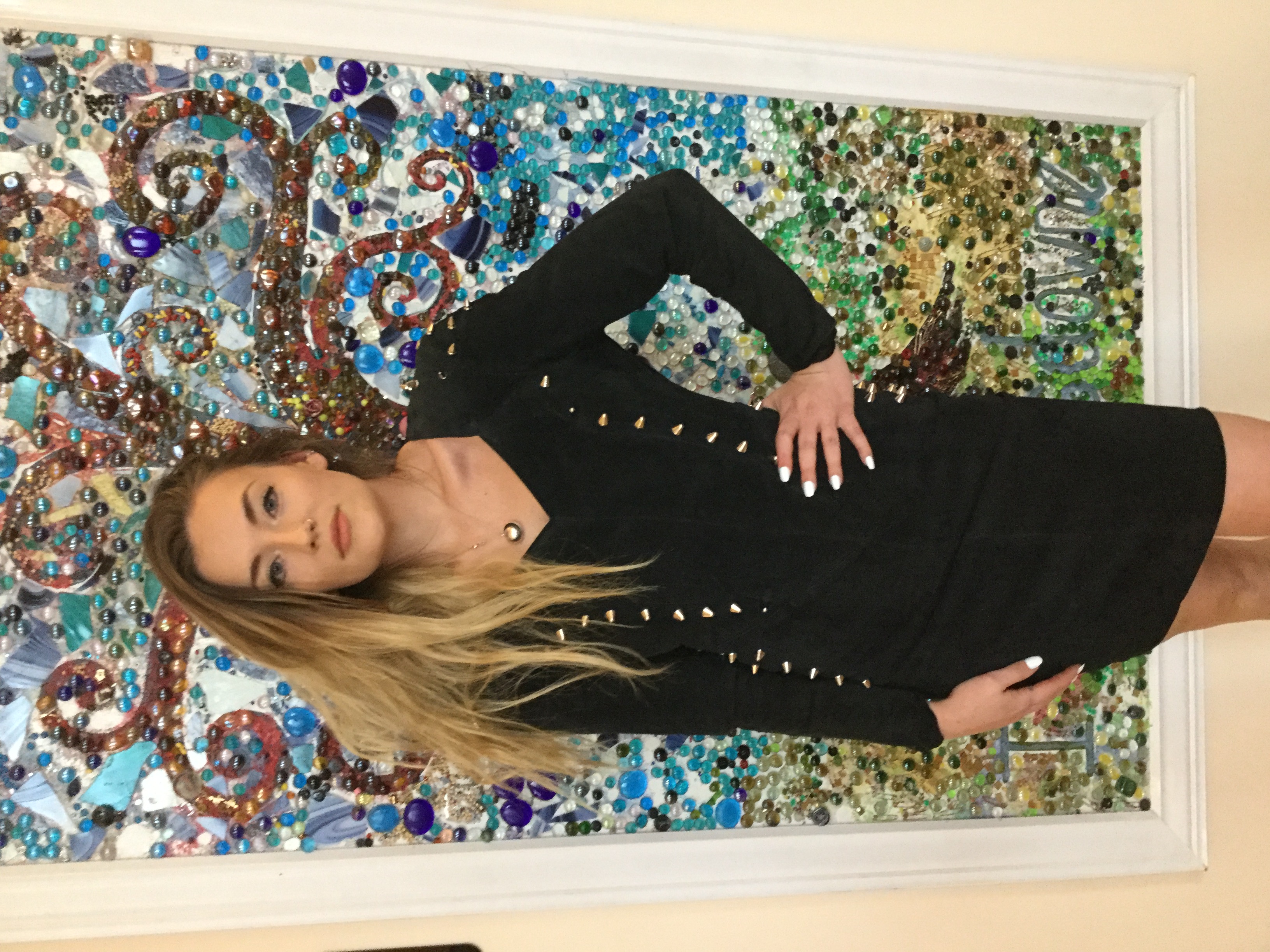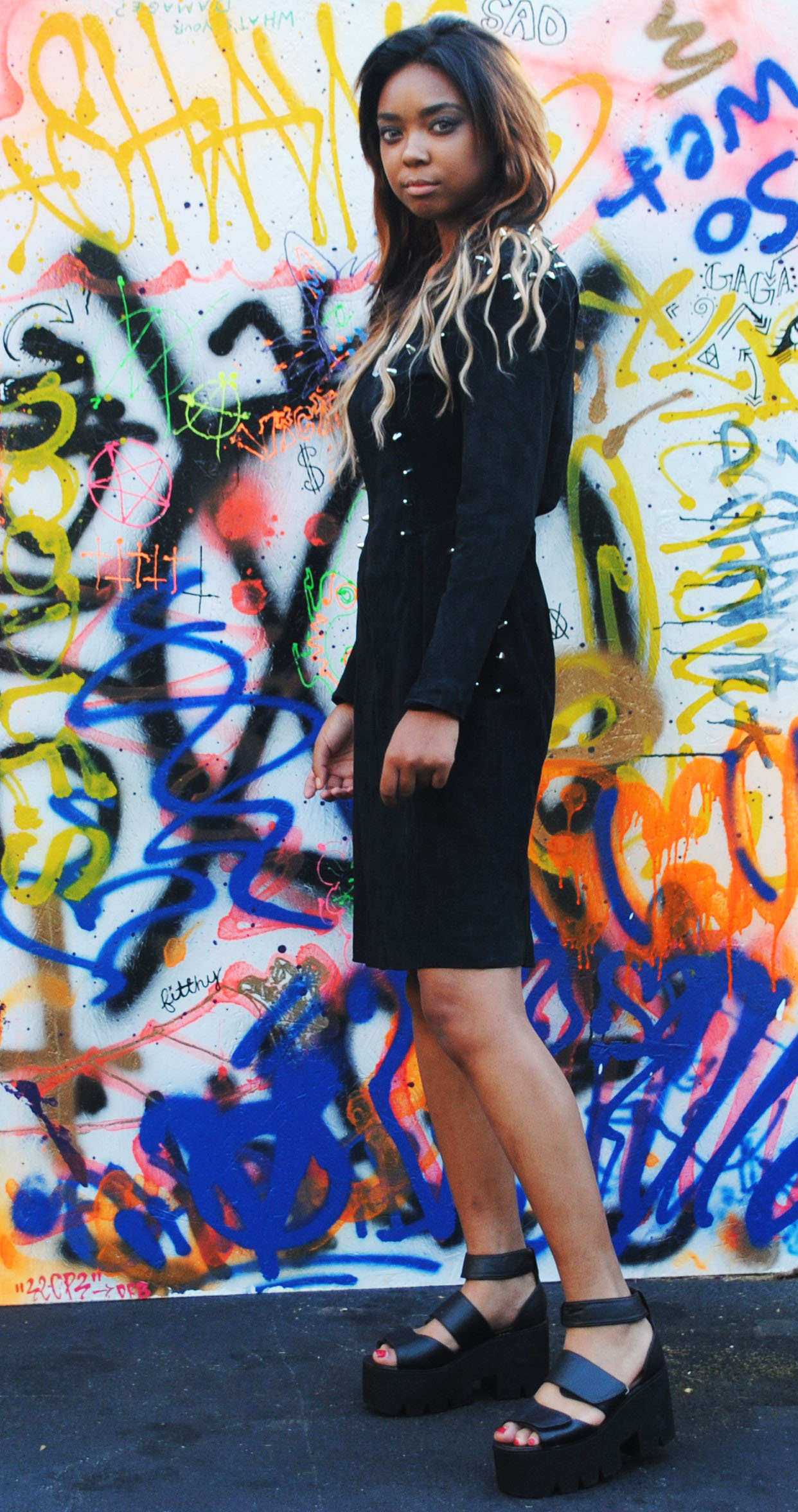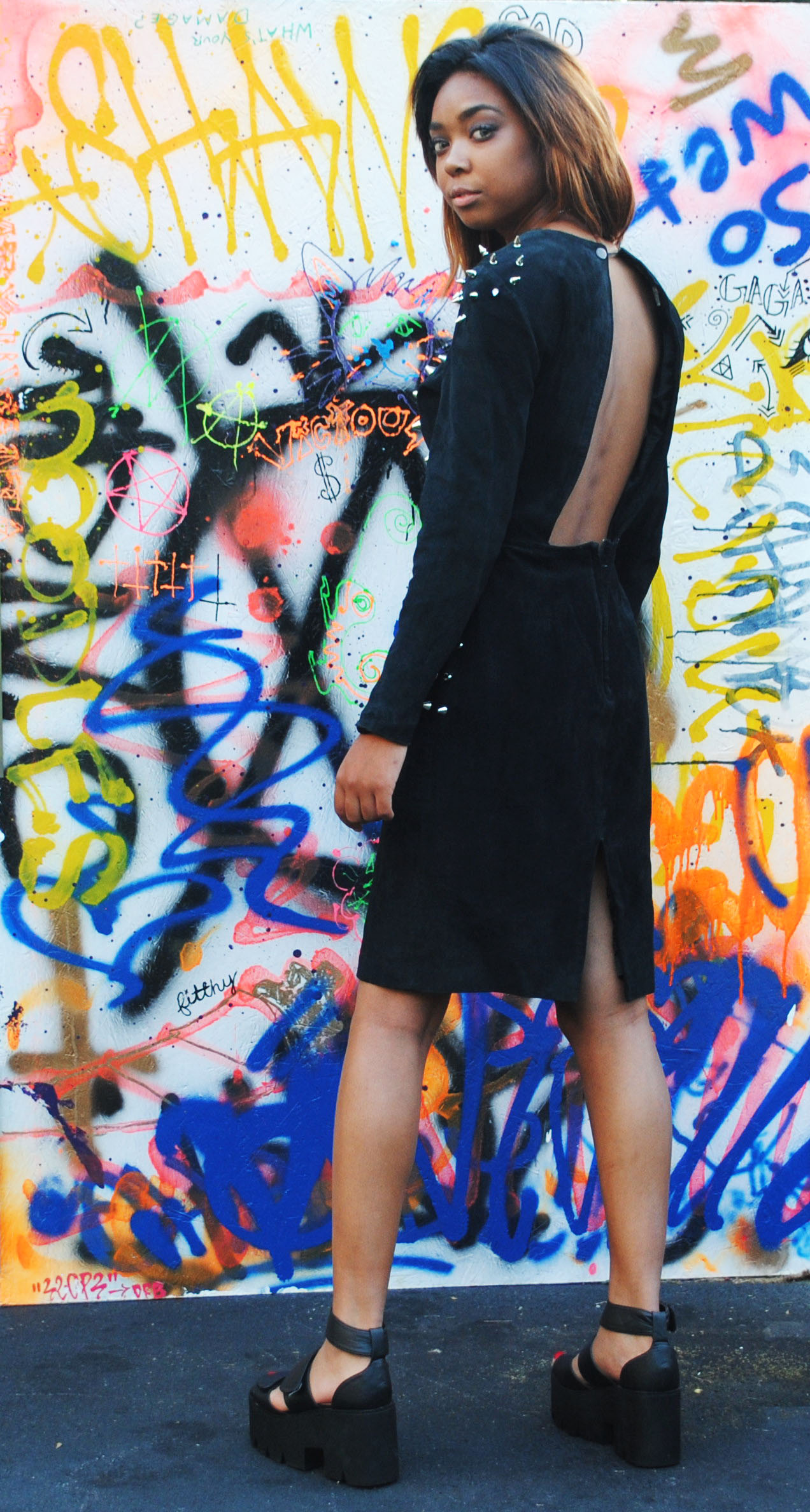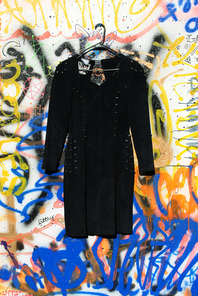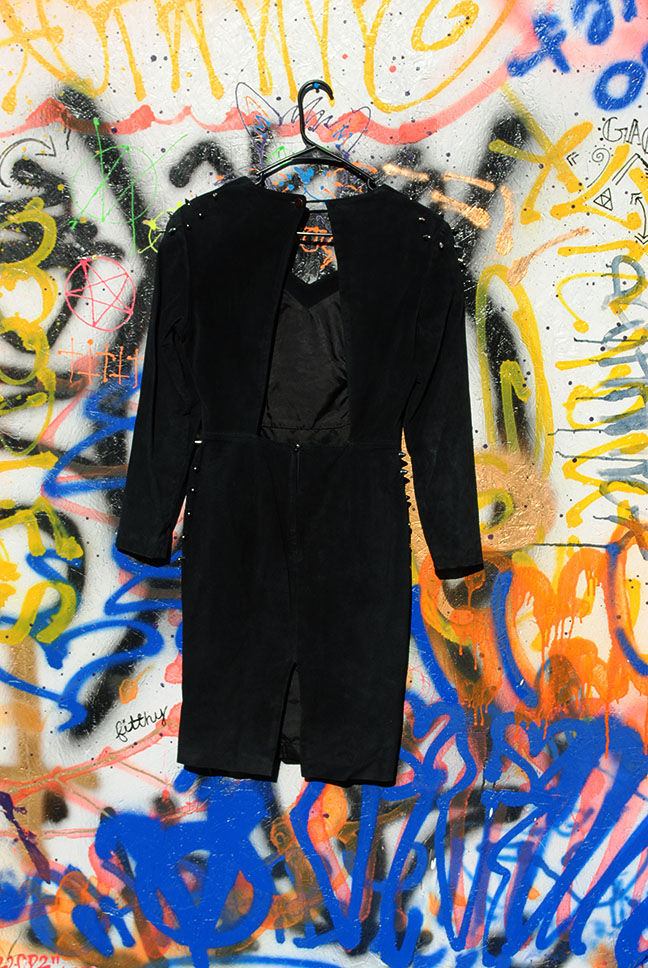This hand-made, one-of-a-kind, up-cycled vintage suede dress was spiked on the shoulders with metal spikes, and along the princess lines and hips on the front with metal cone spikes. Open back.