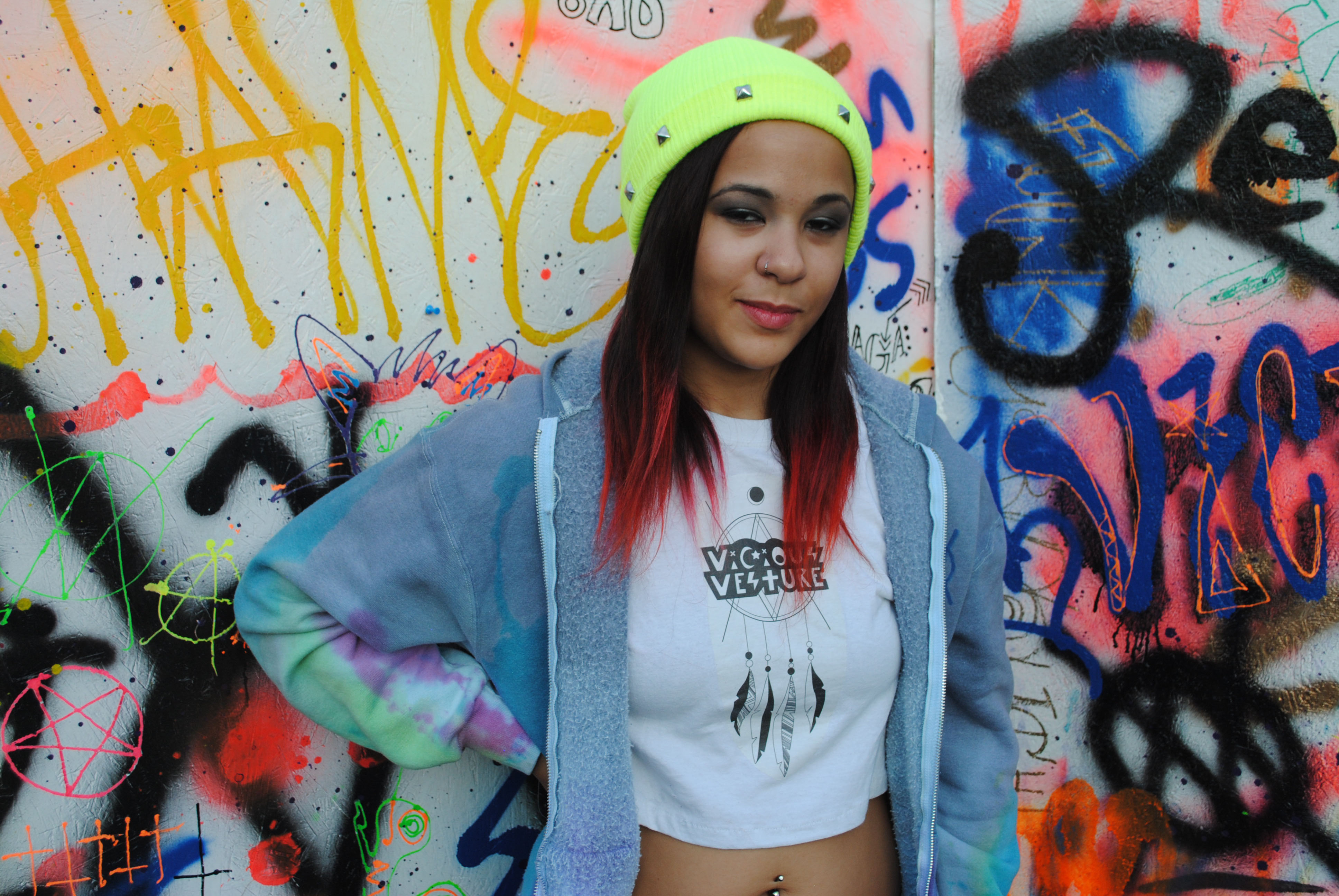 This Studded Cotton Beanie was hand-made & rocked-out by the artist with metal pyramid studs. One Size Color: highlighter yellow Hand-made & designed in Philadelphia, PA