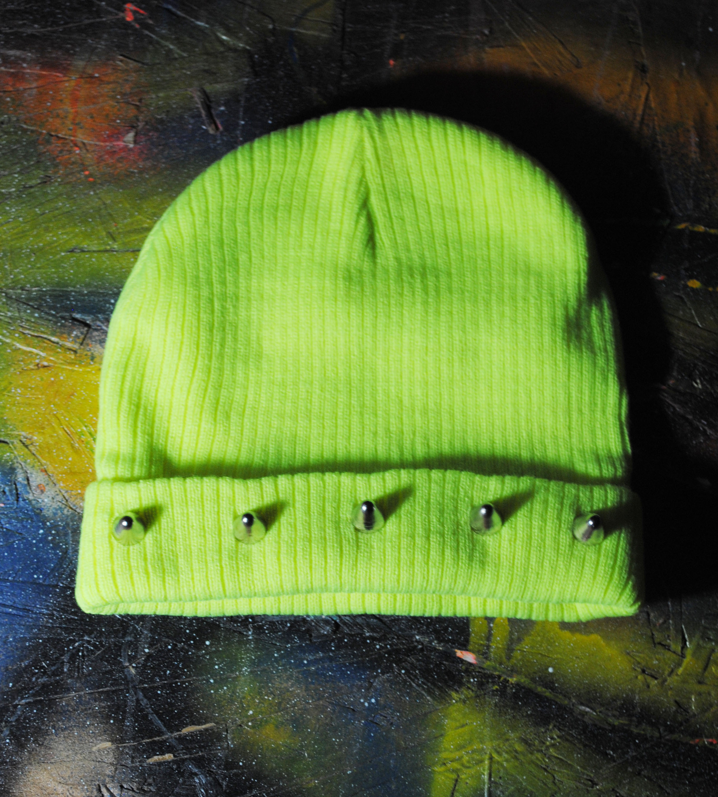 This Spiked Cotton Beanie was hand-made & rocked-out by the artist with metal cone spikes.