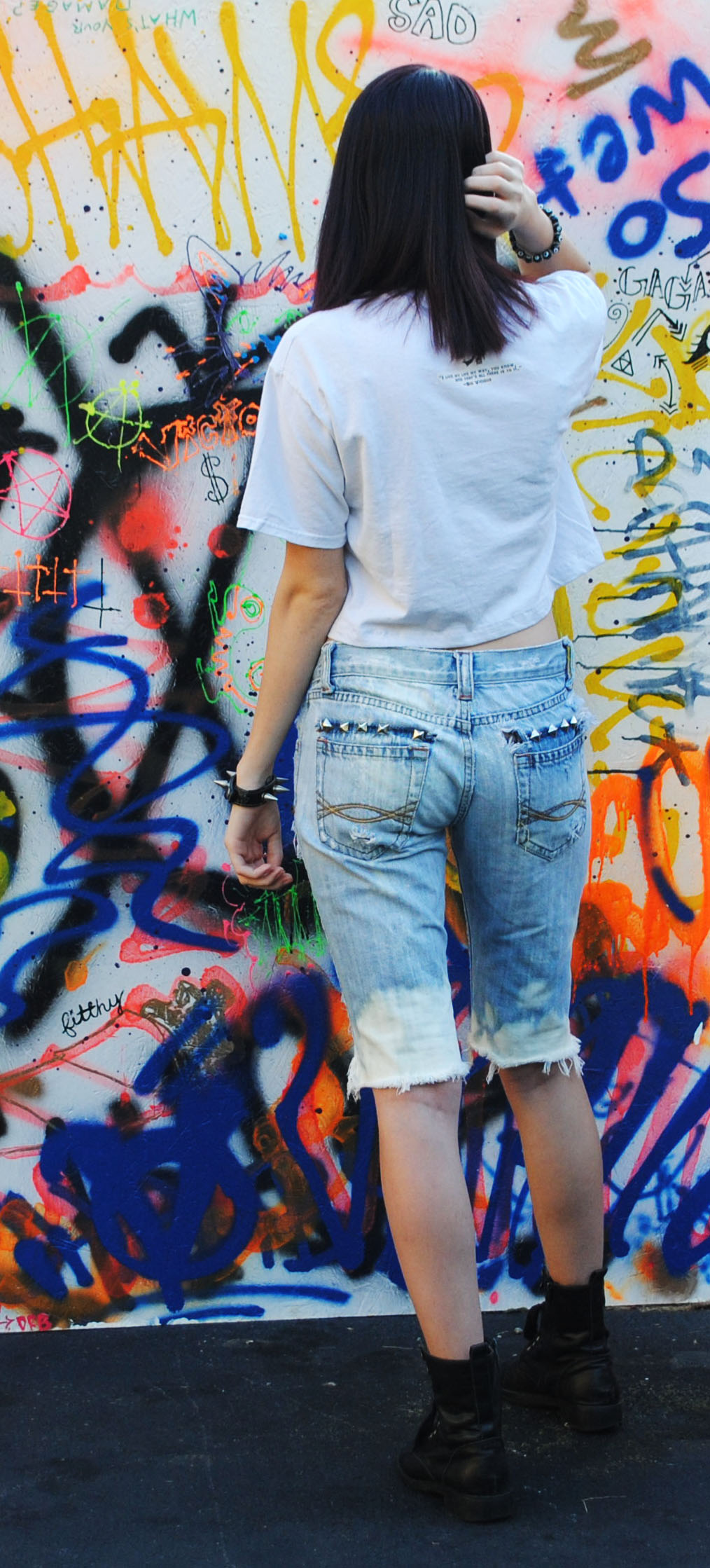 These one-of-a-kind & rocked-out Abercrombie jeans were cut-off and turned into shorts, dip dyed with bleach & studded to perfection. Size 2 Hand-made & designed in Philadelphia, PA