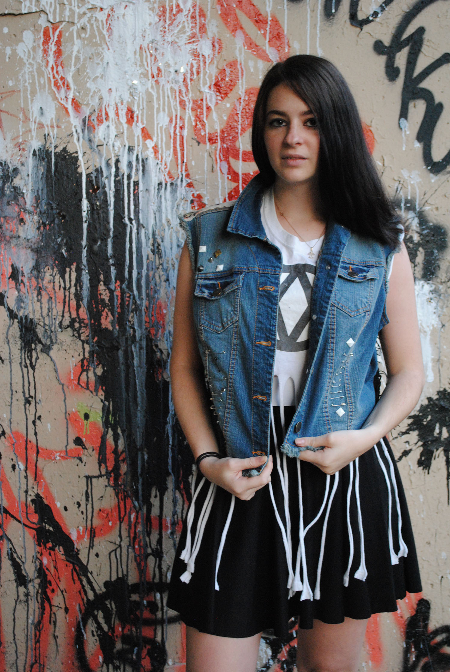 This hand-made, one-of-a-kind, upcycled denim vest features studs and fringe on the front back and sides as well as an eagle back patch.