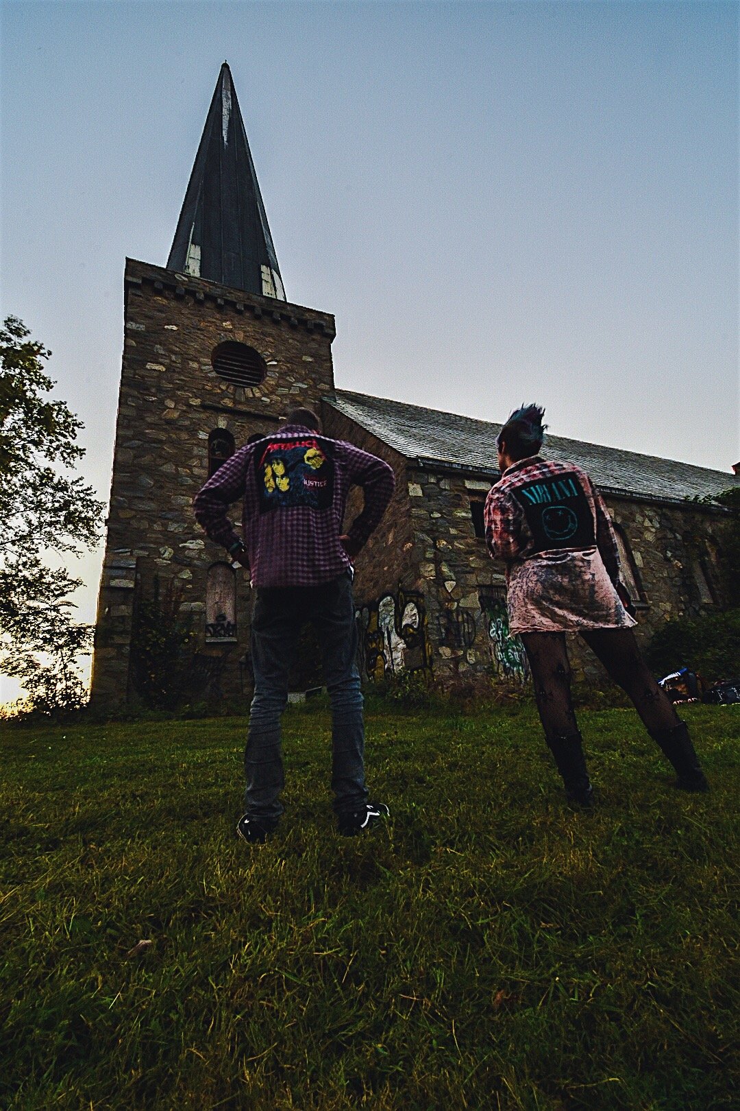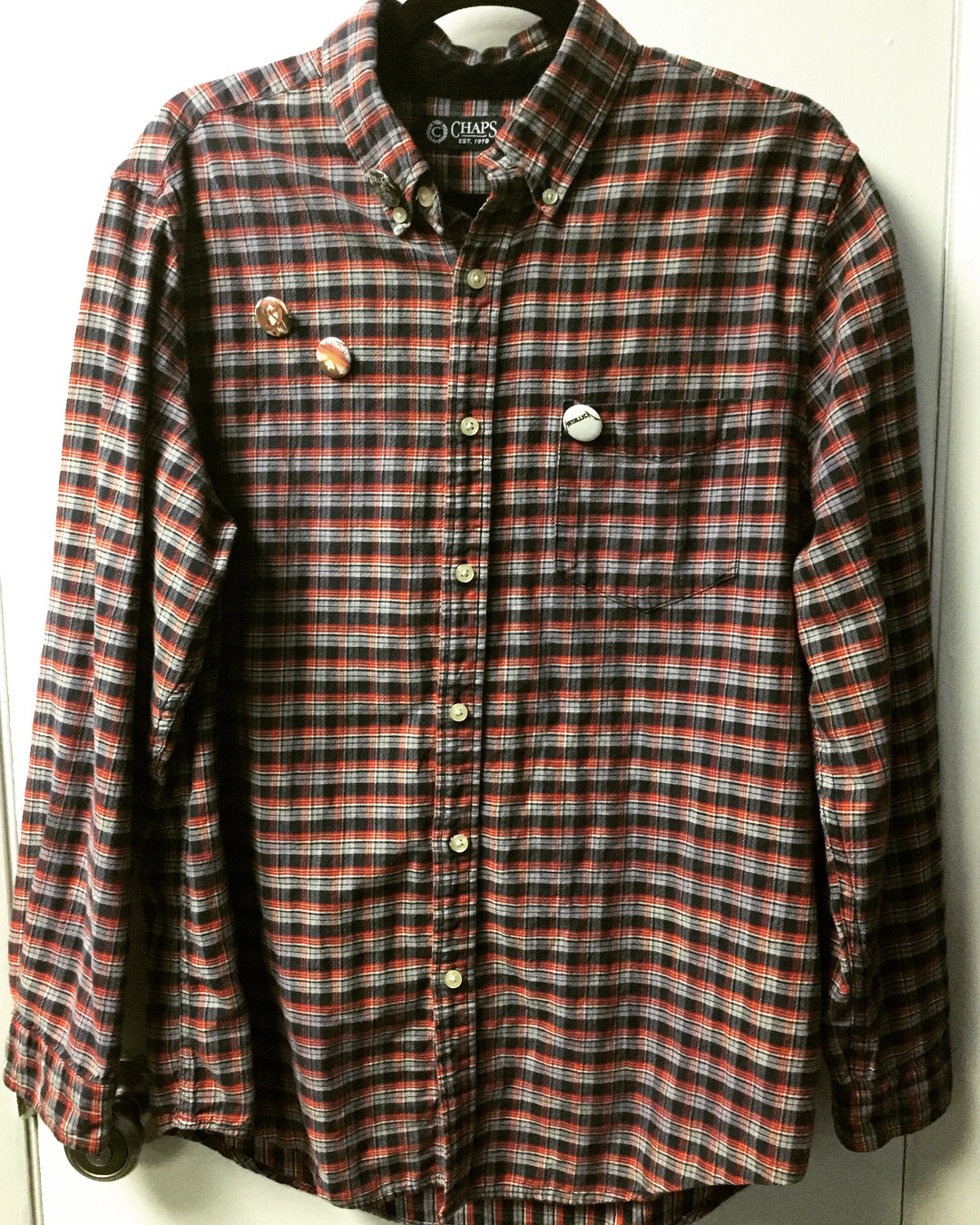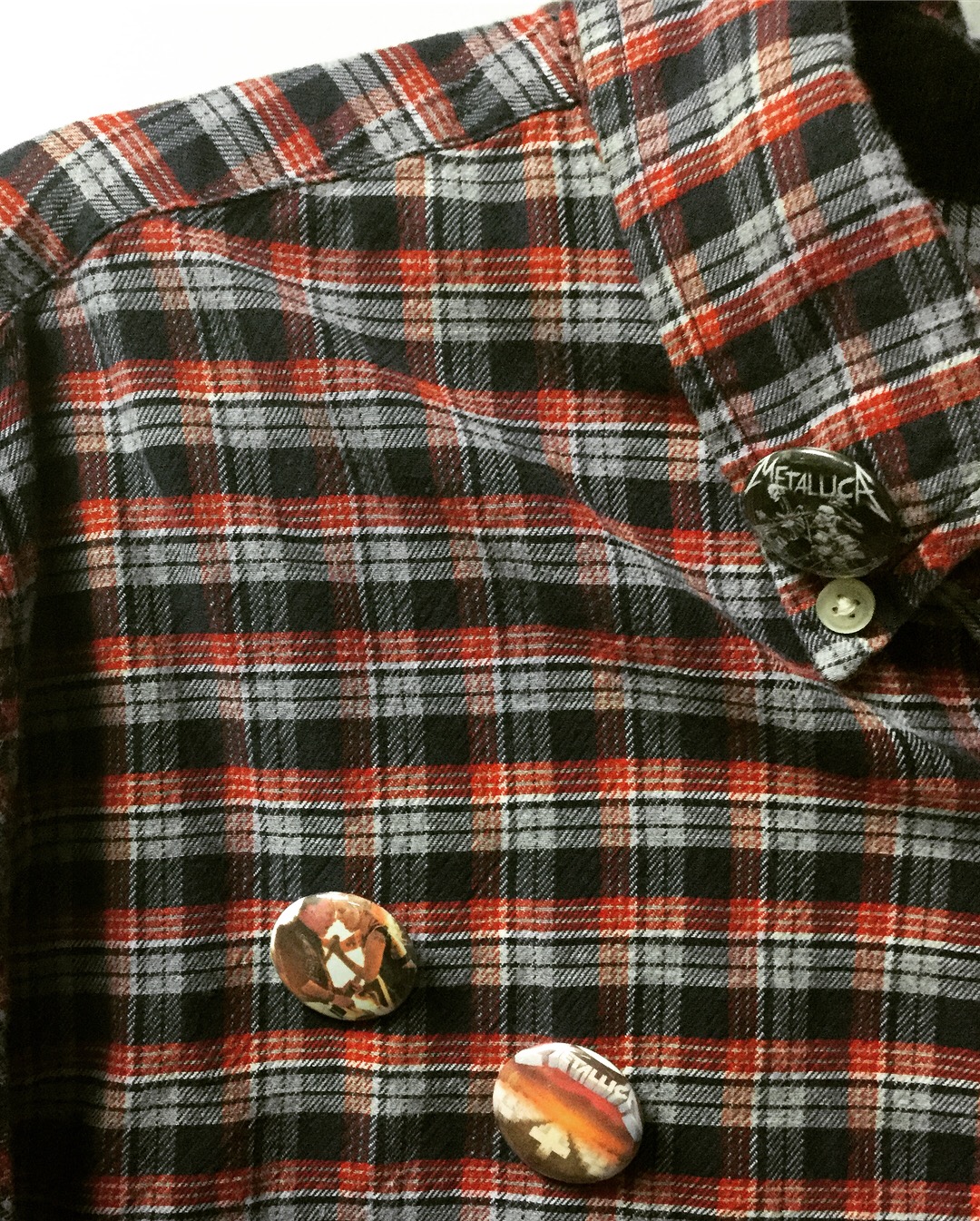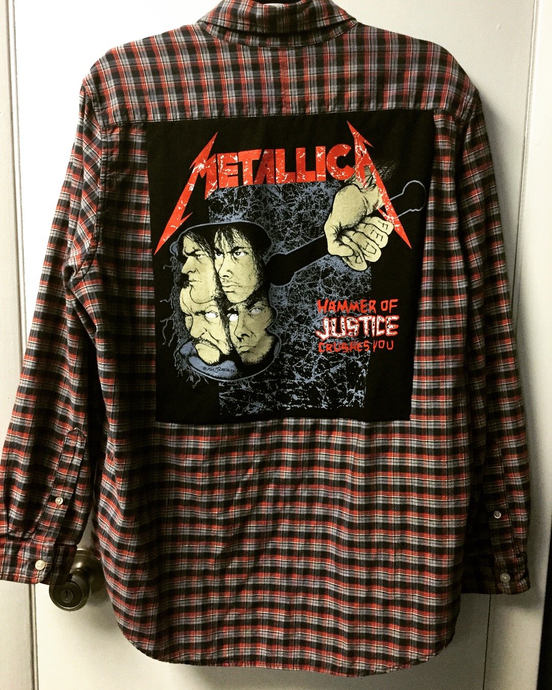 Hand-made, one-of-a-kind, upcycled flannel with Metallica pins and Hammer of Justice Backpatch SIZE XL