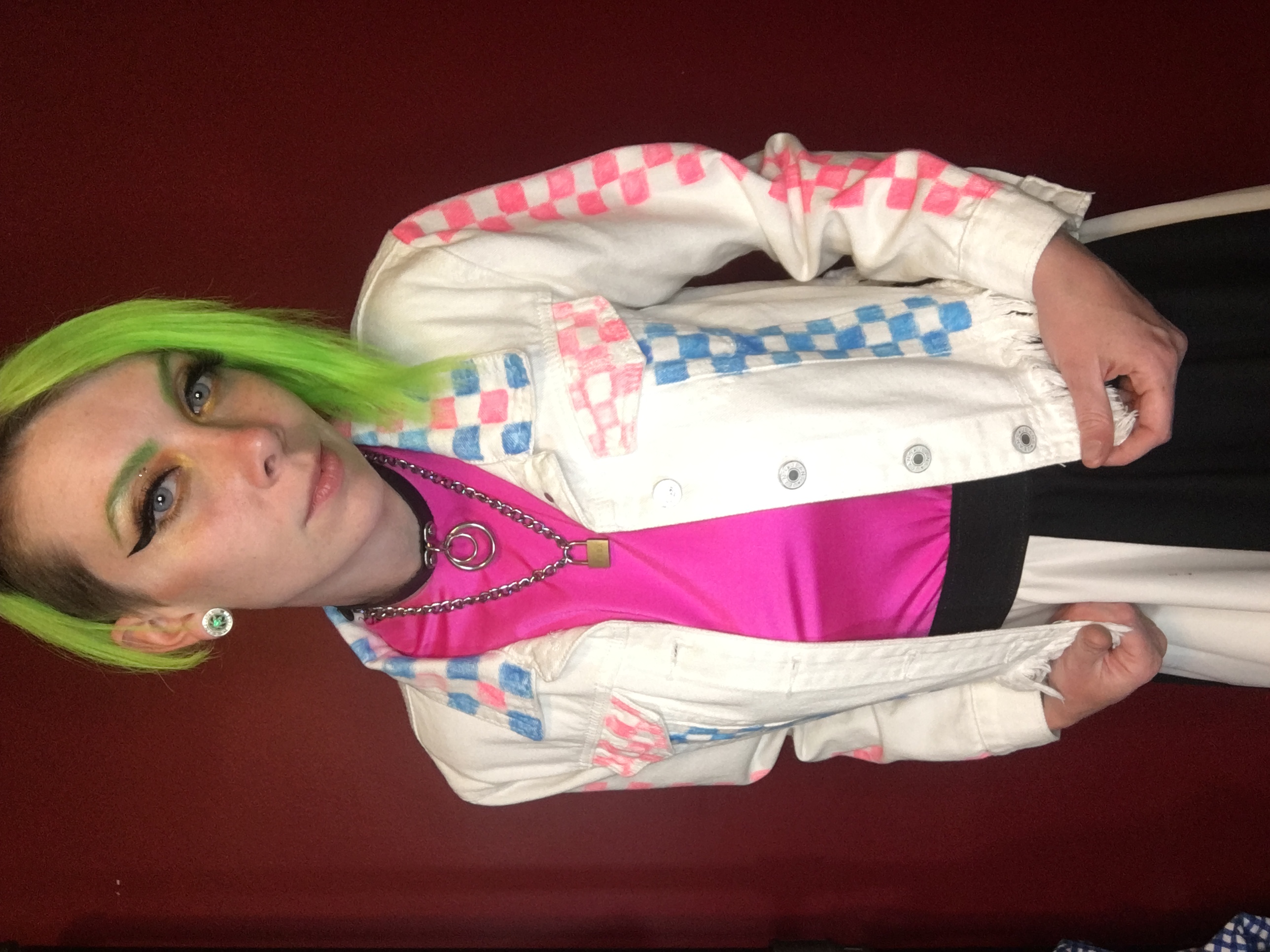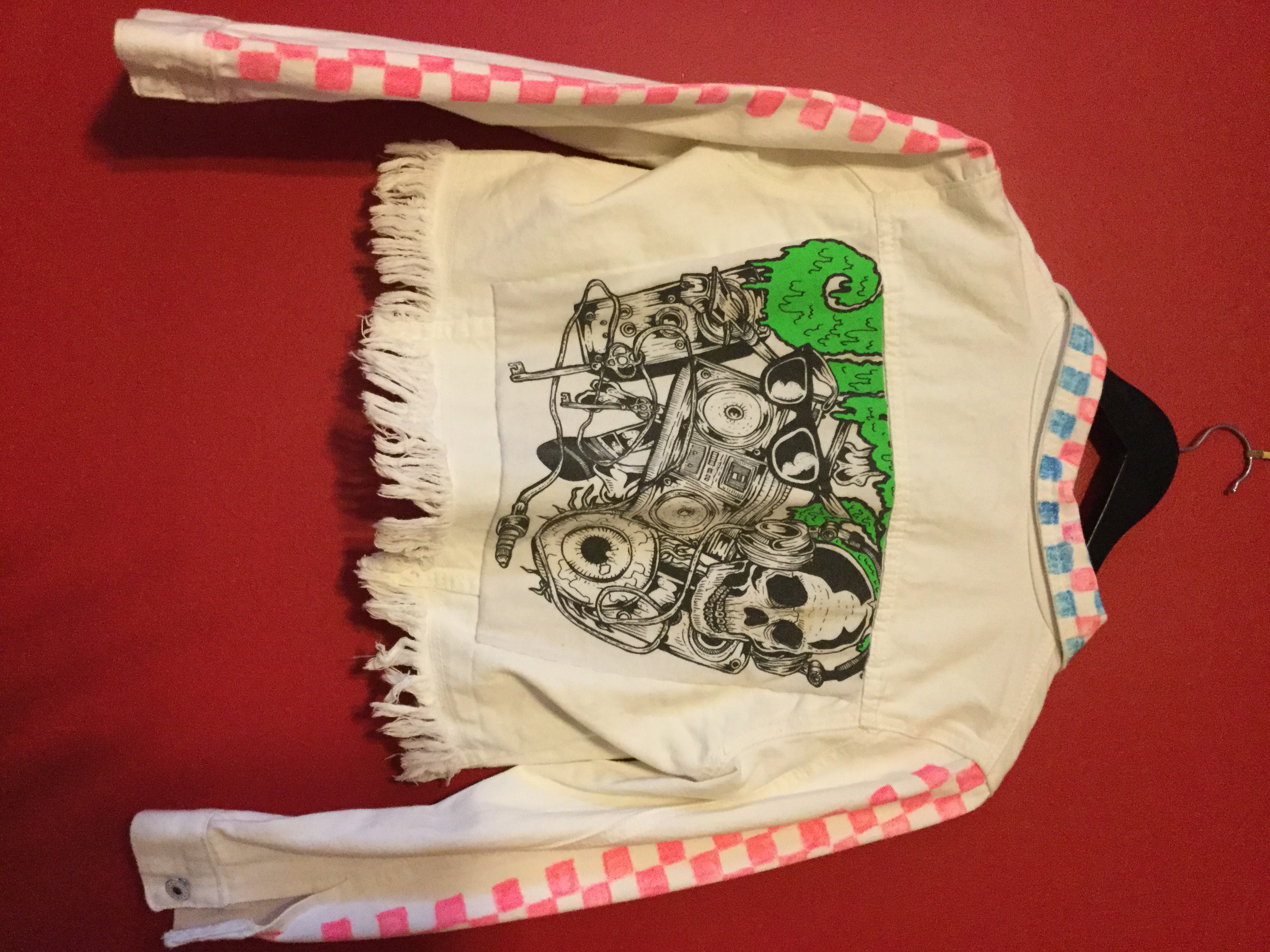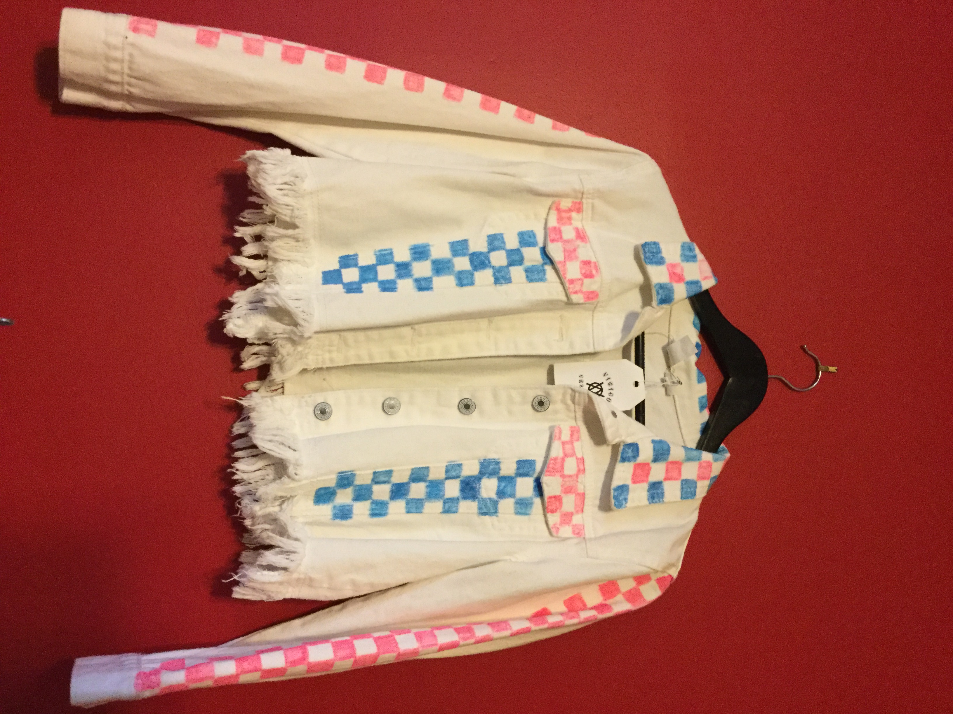 Cropped Denim Jacket up-cycled with graphic backpatch and hand-painted checkers