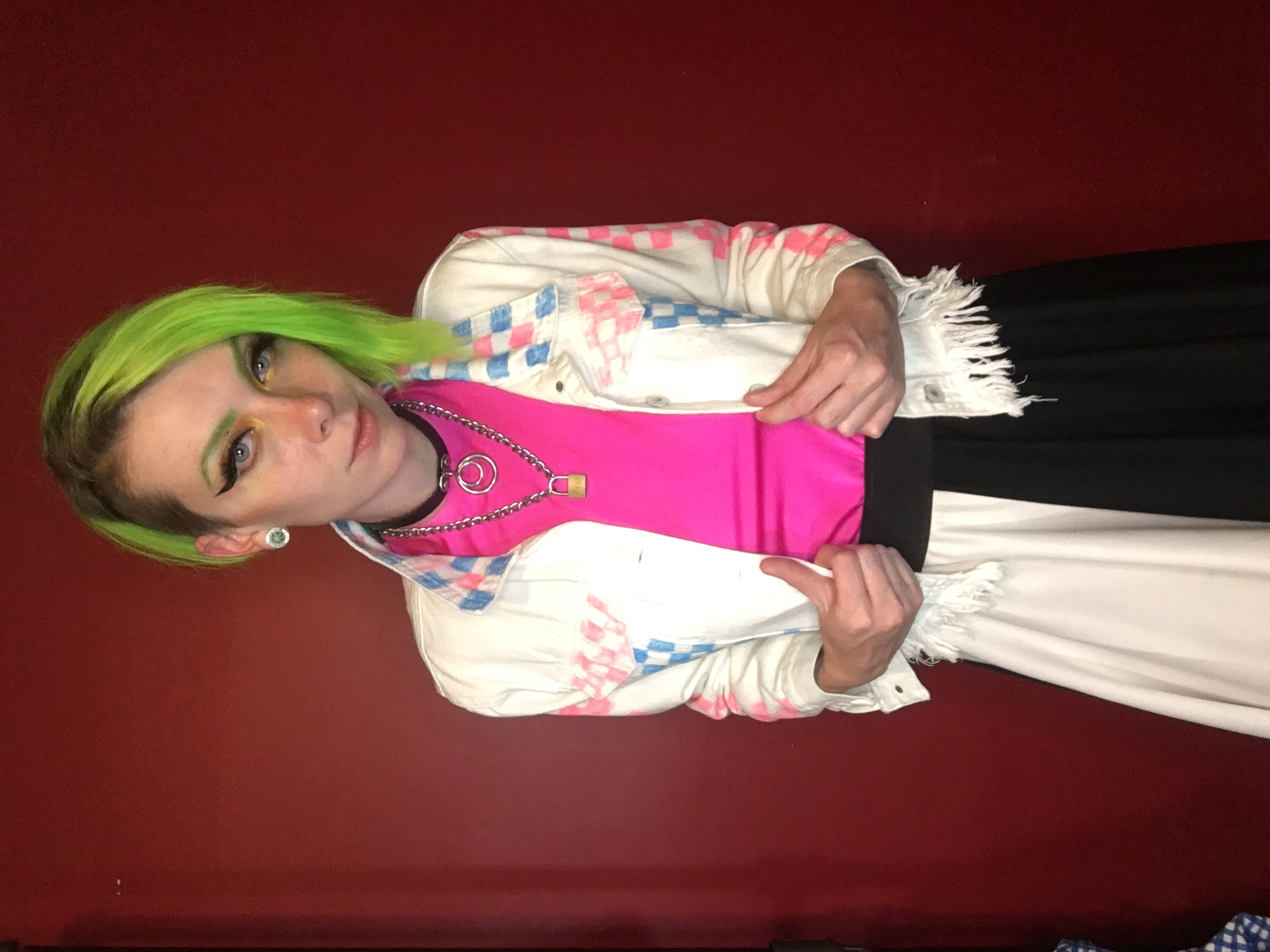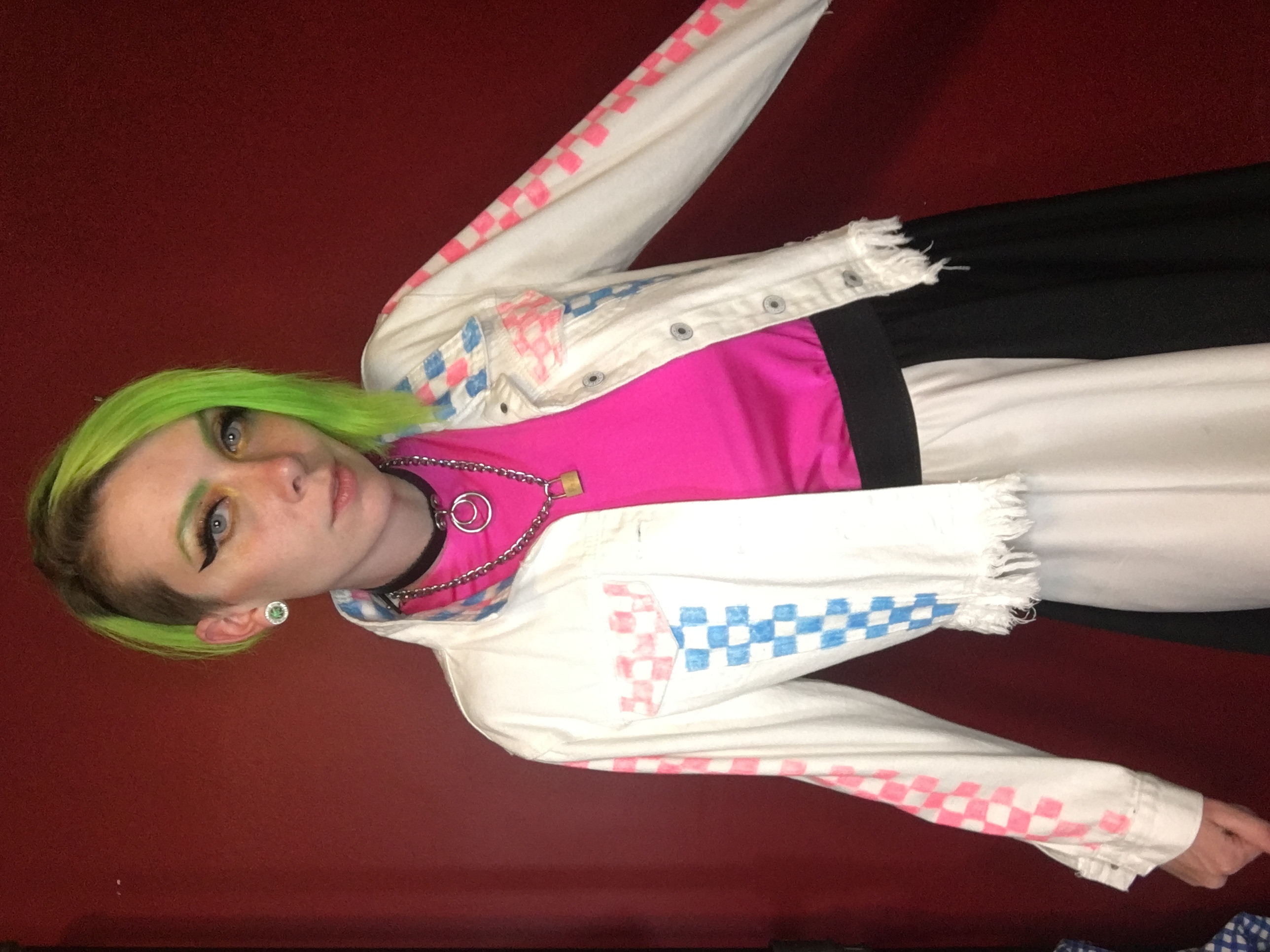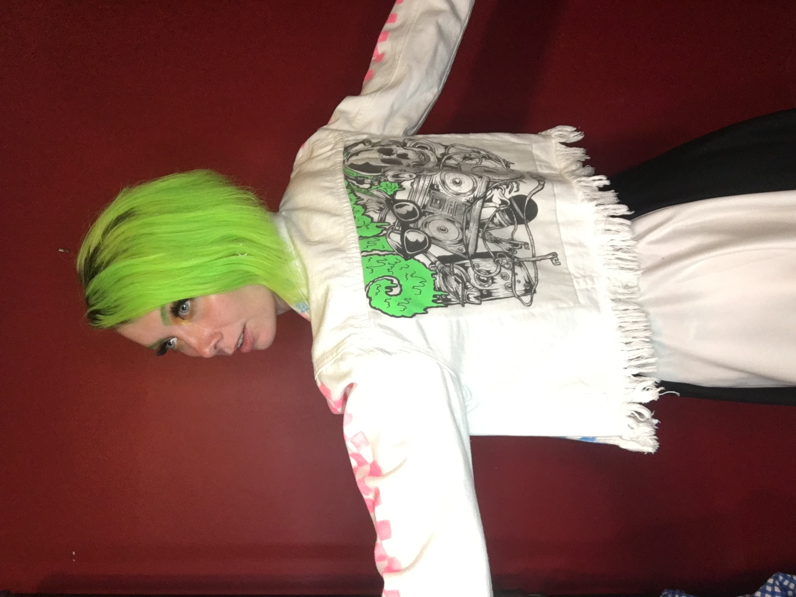 Cropped Denim Jacket up-cycled with graphic backpatch and hand-painted checkers