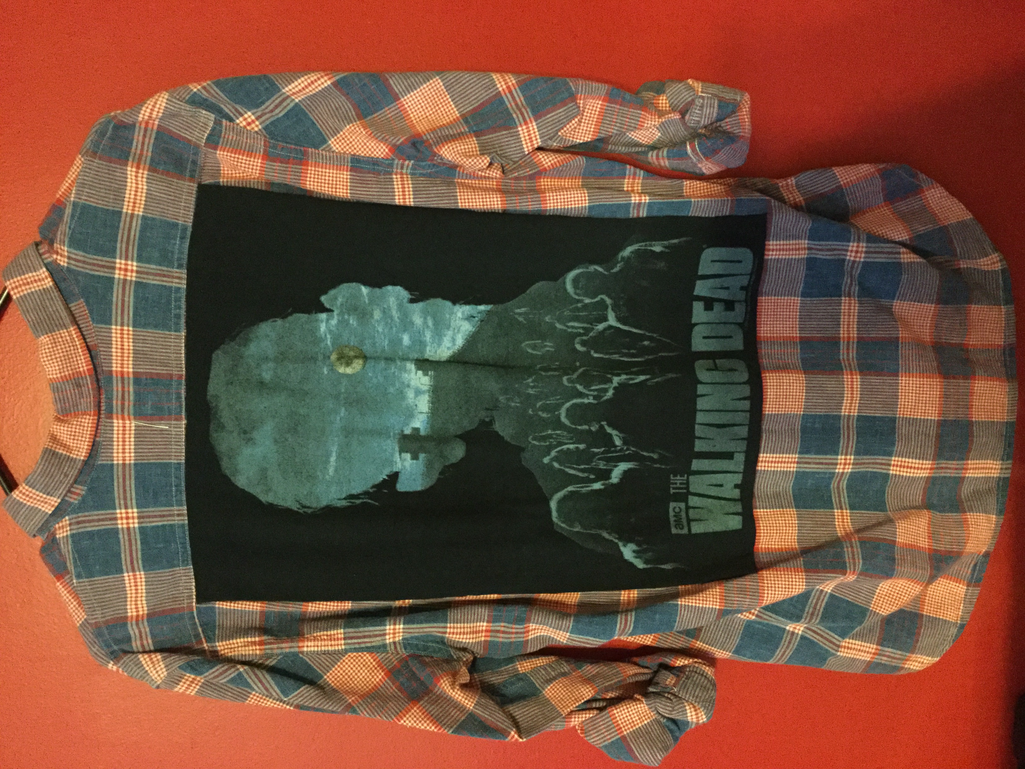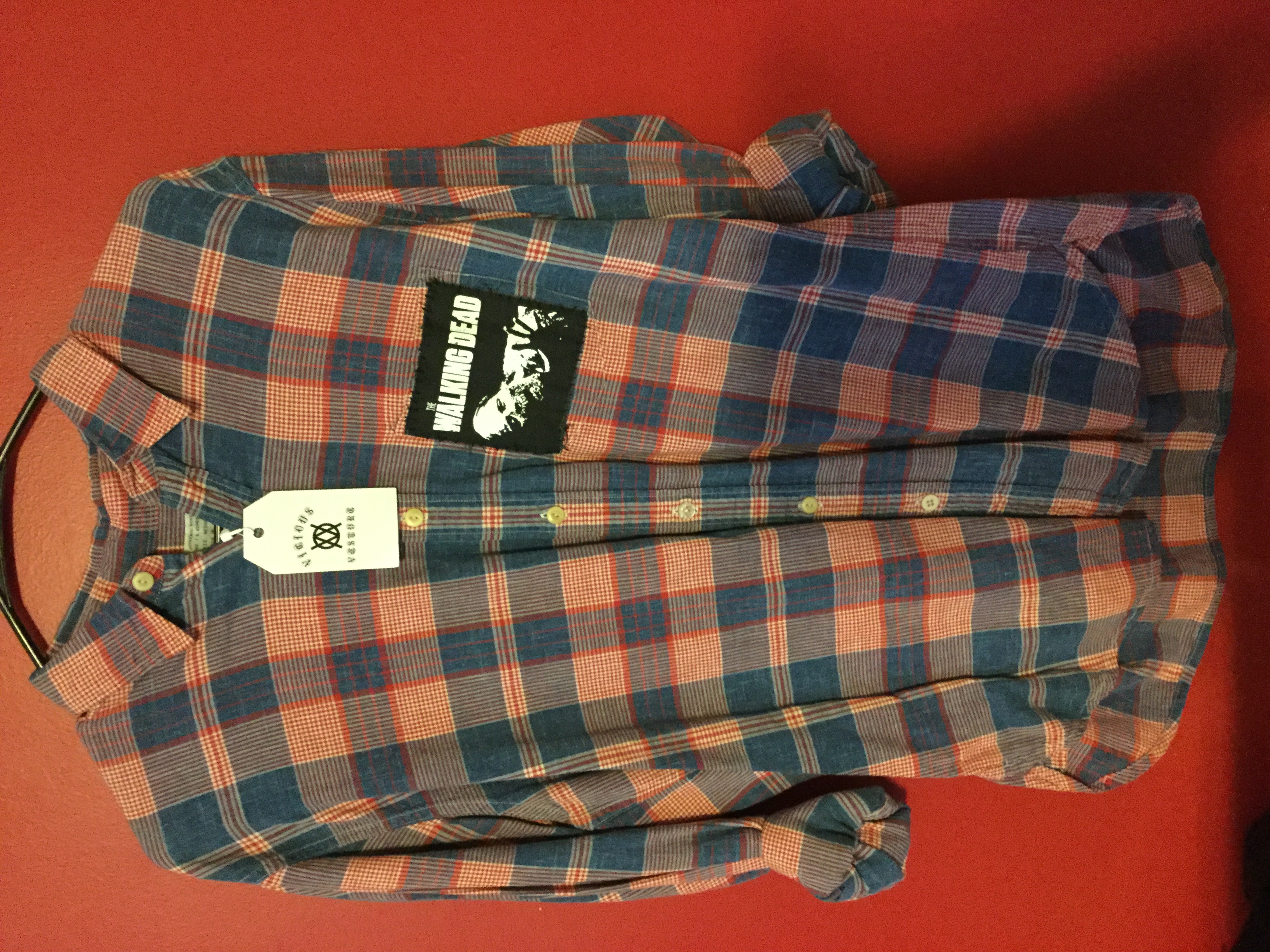 Up-cycled button up shirt with Walking Dead patch and back patch