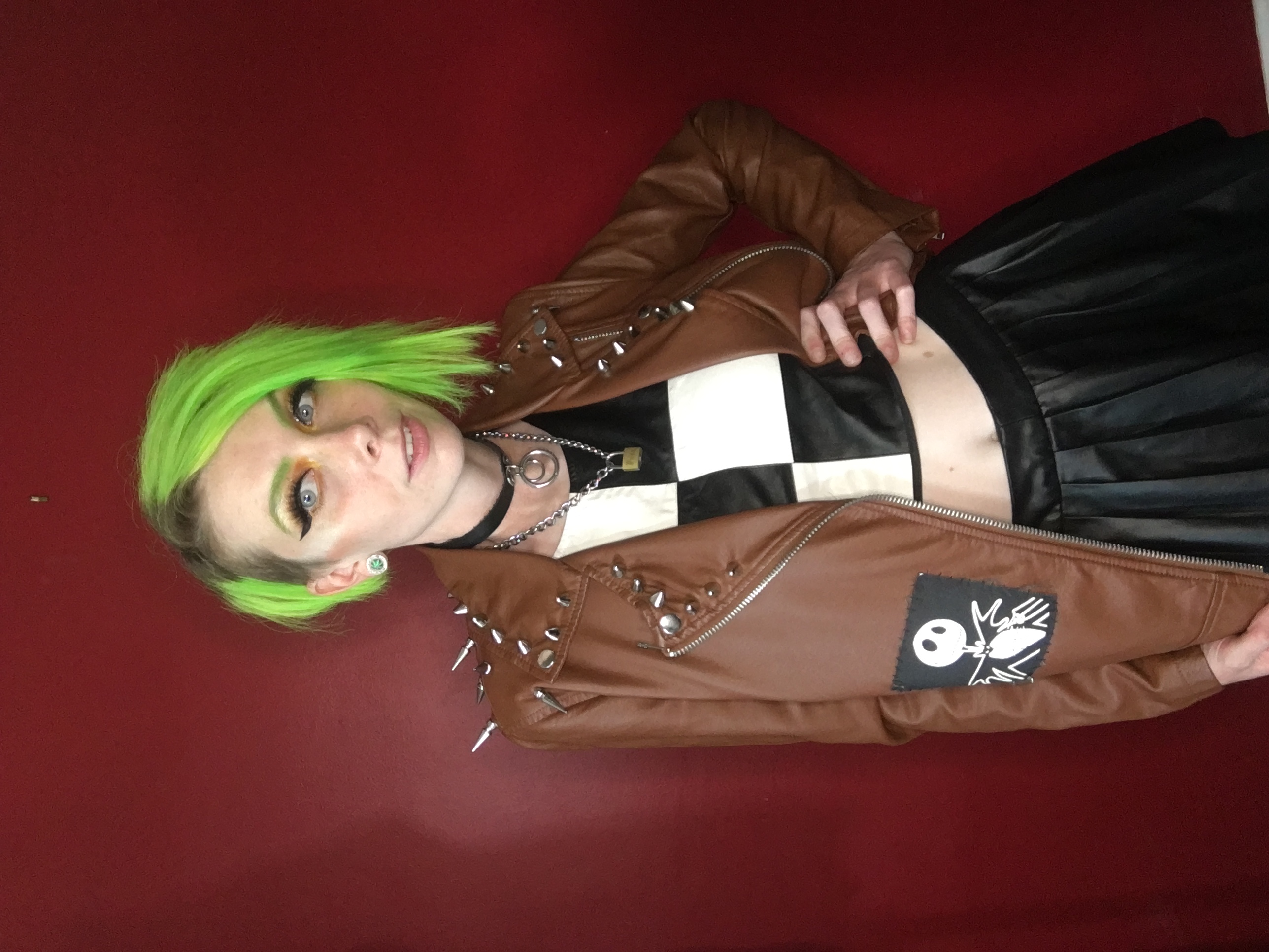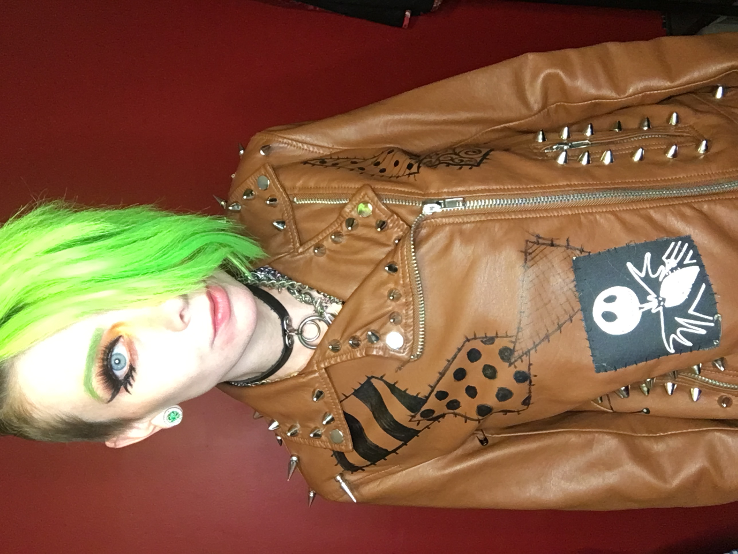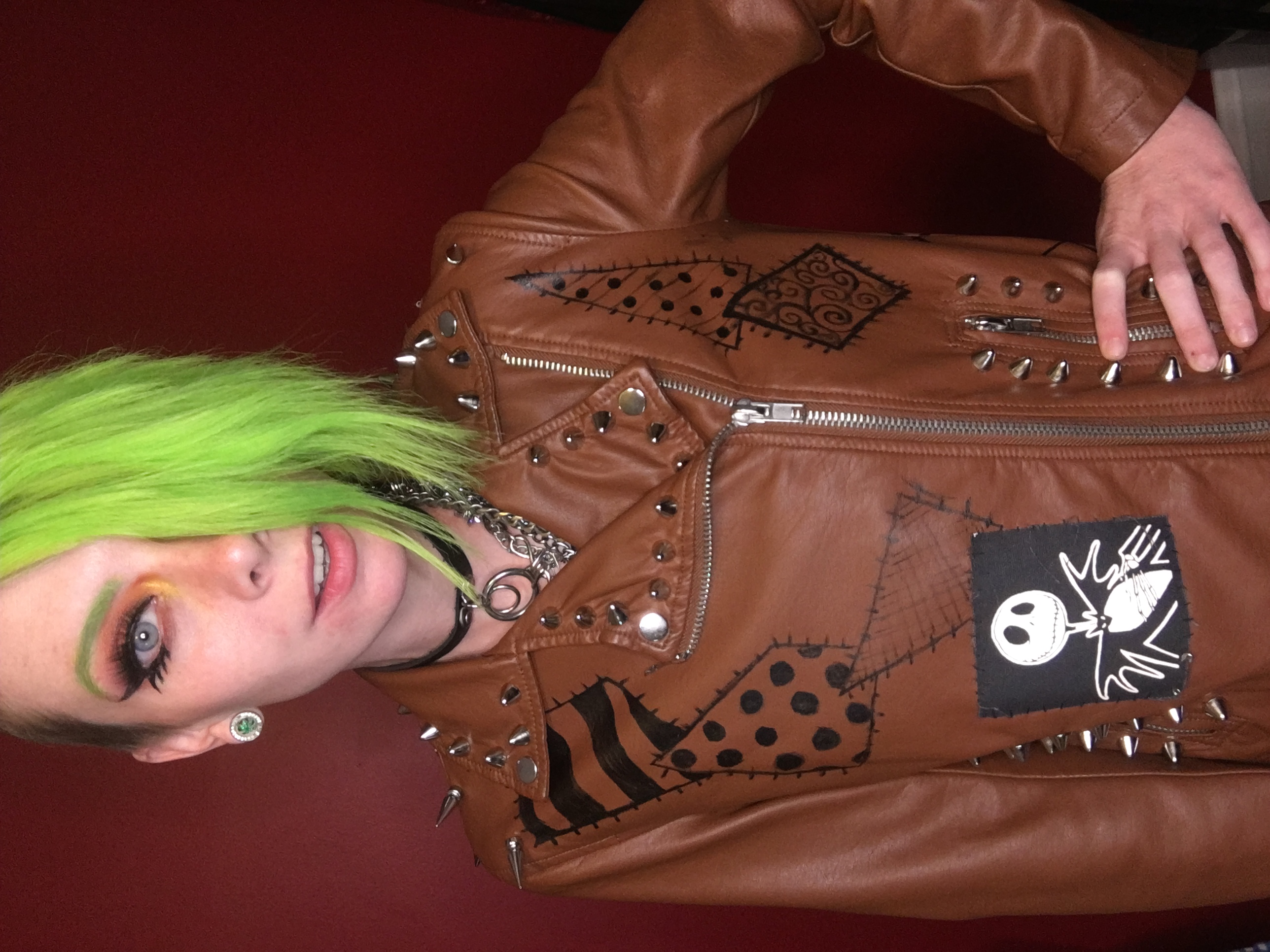 Up-cycled tan leather jacket with spikes and Jack Skellington patch REVAMPED with “Nightmare” hand-painted across back with hand-painted logo