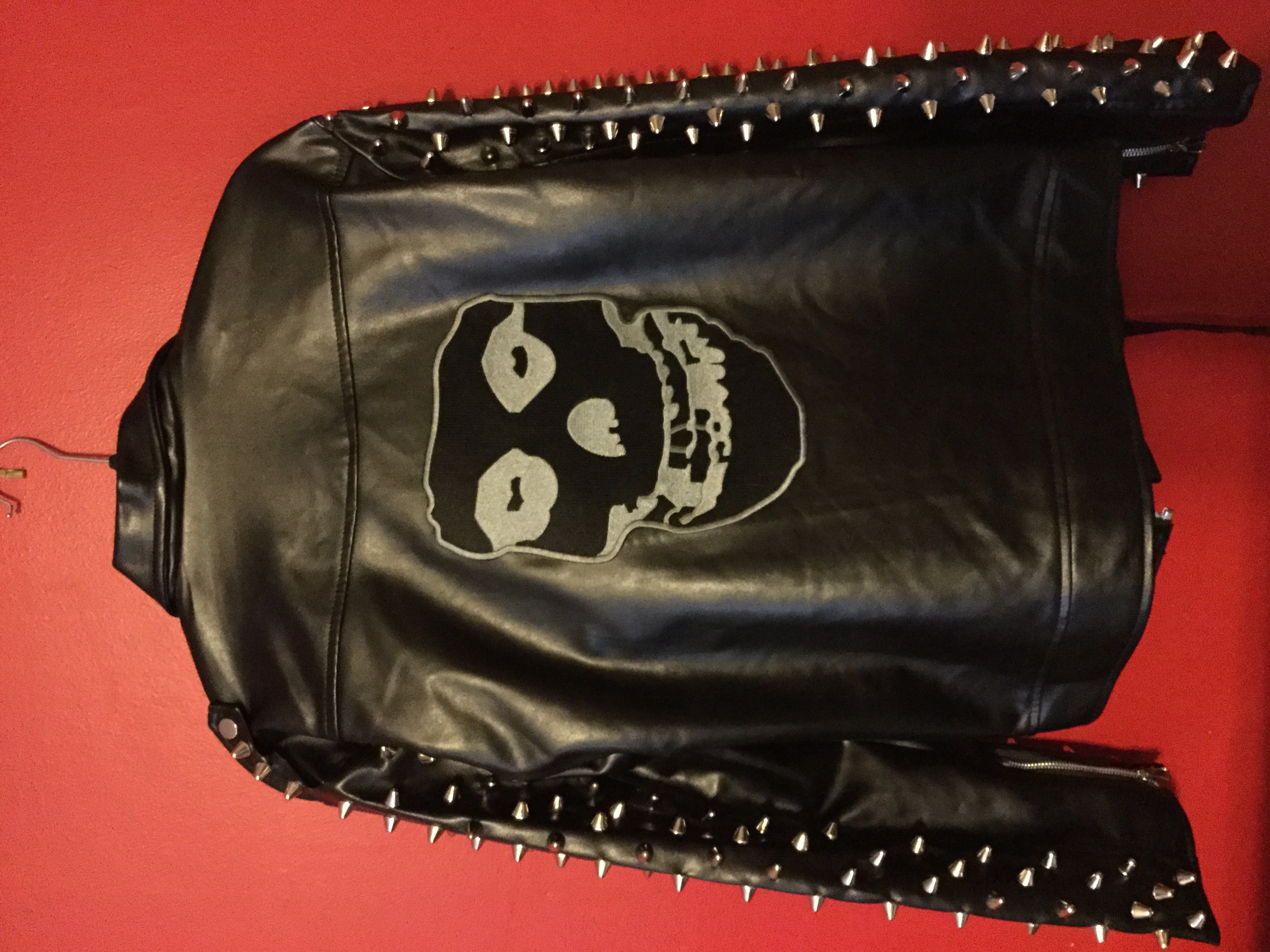 ORIGINAL SOLD Up-cycled leather jacket with Misfits patches as well as bad brains and black flag patch, also features fully spiked sleeves, hand-made by Shelby Cobra