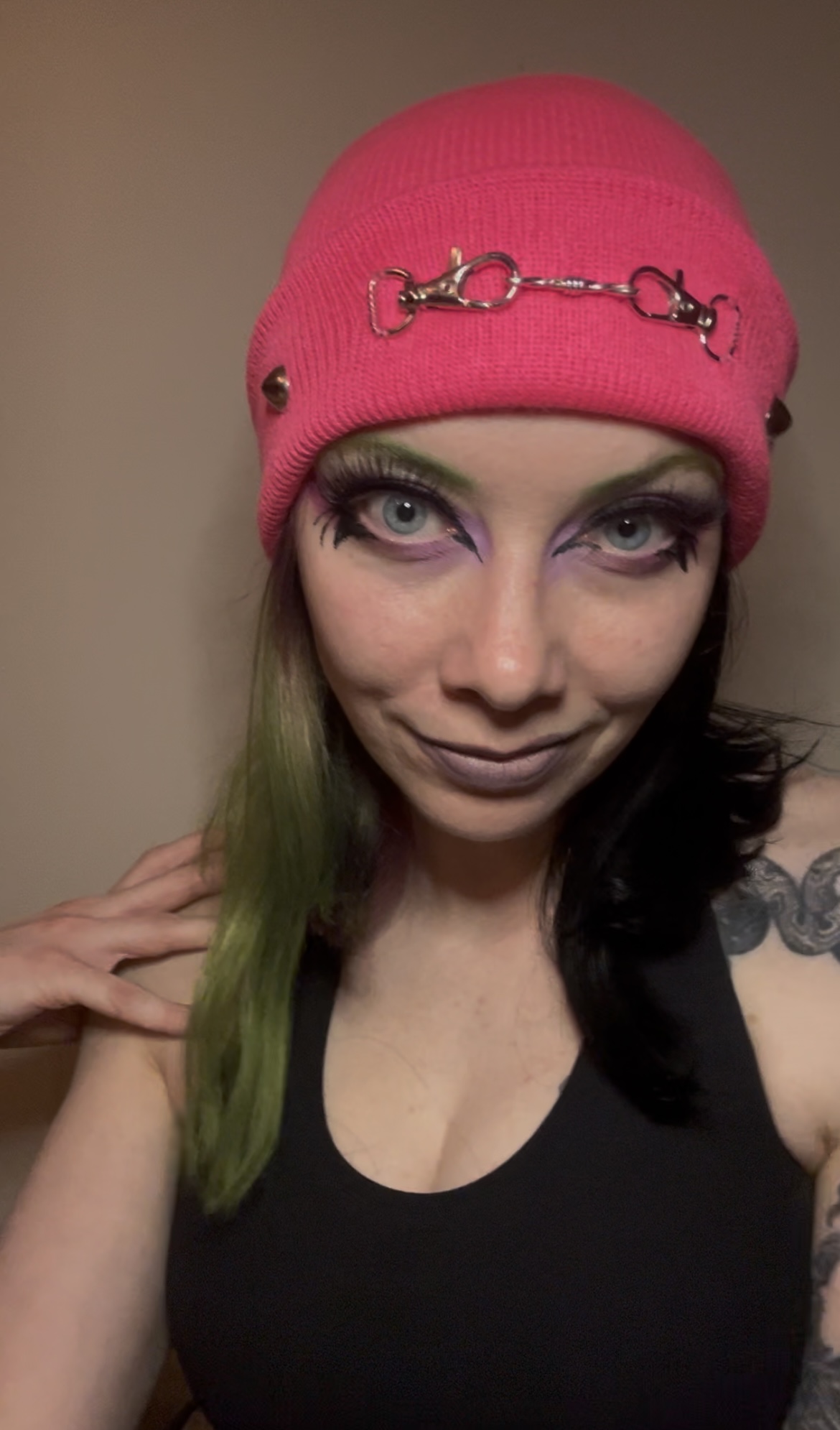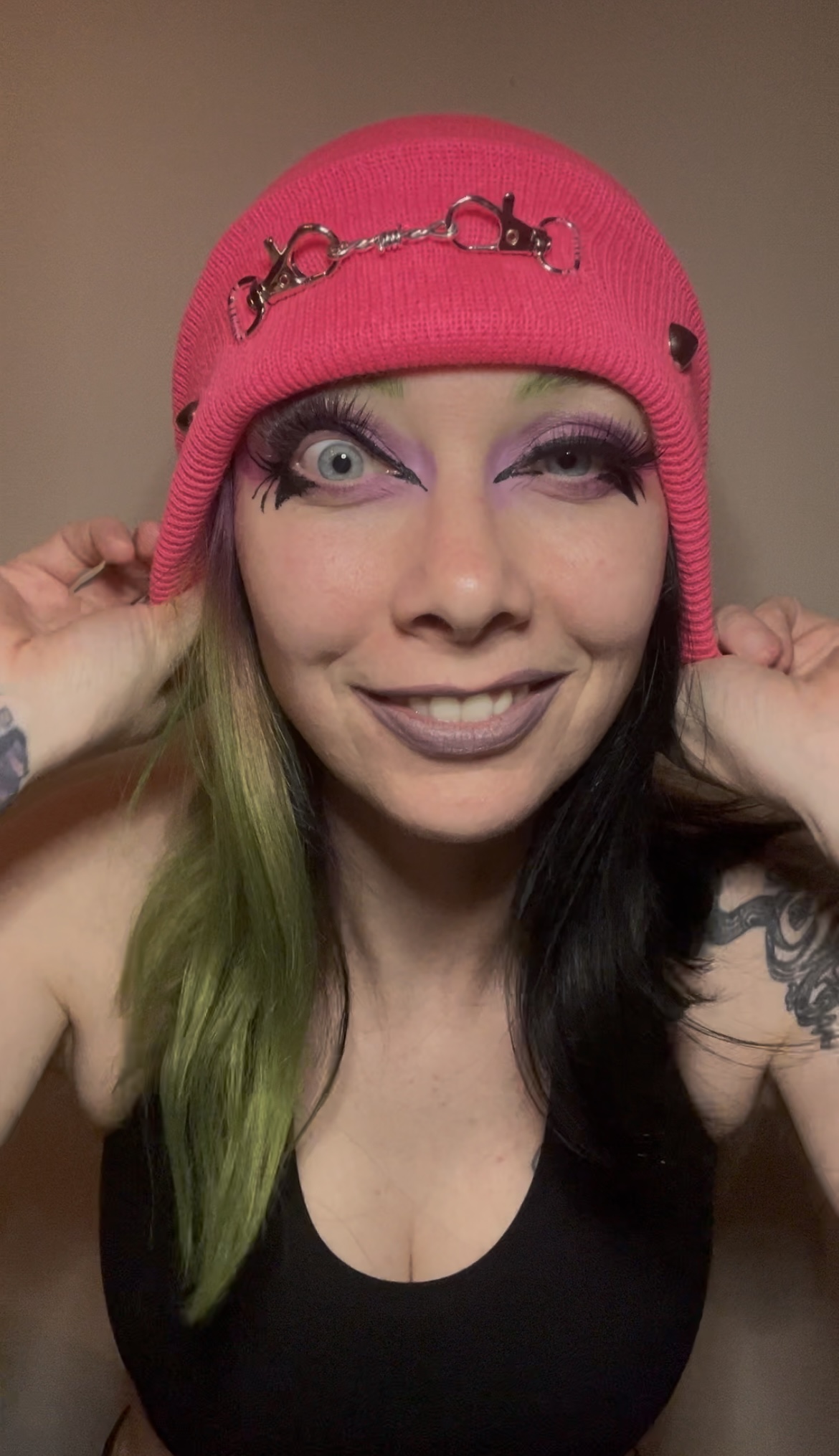 Pink beanie with studs as horns and clips holding a barded wire style chain One size