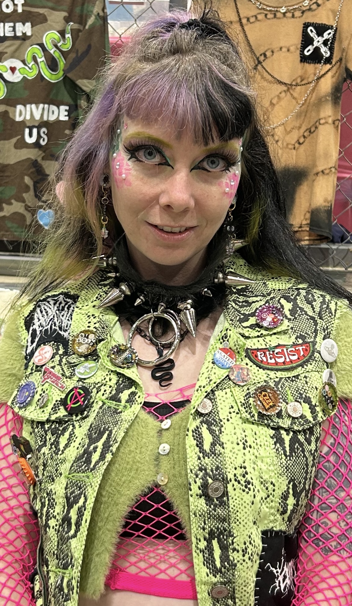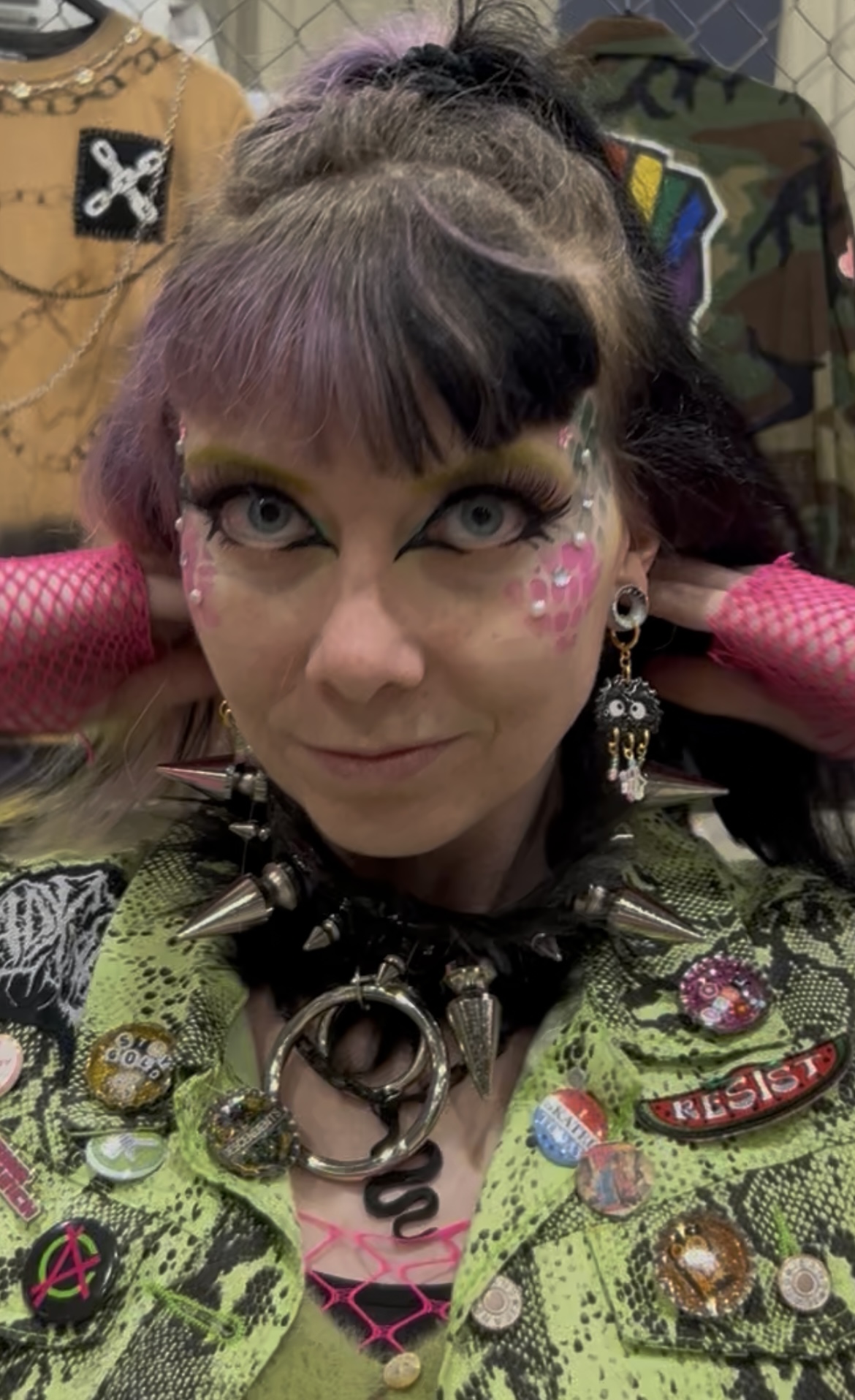 Black faux leather collar with fur and bulldog spikes featuring two O rings and parachute clip closure Size Large