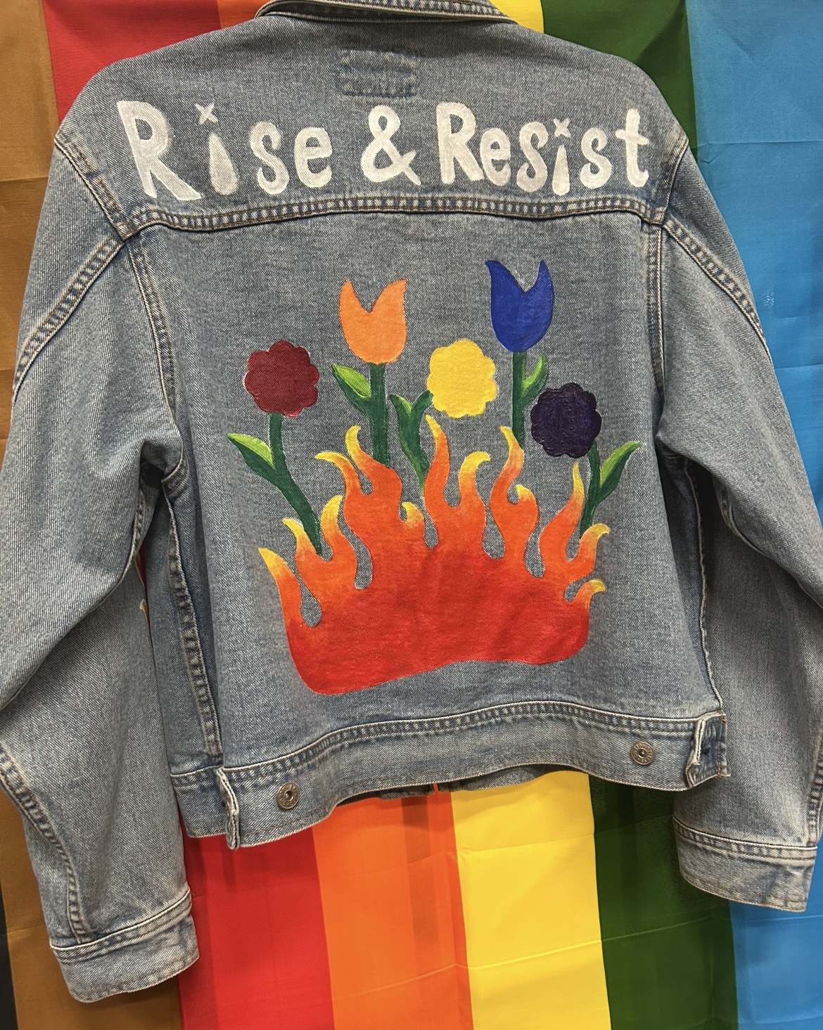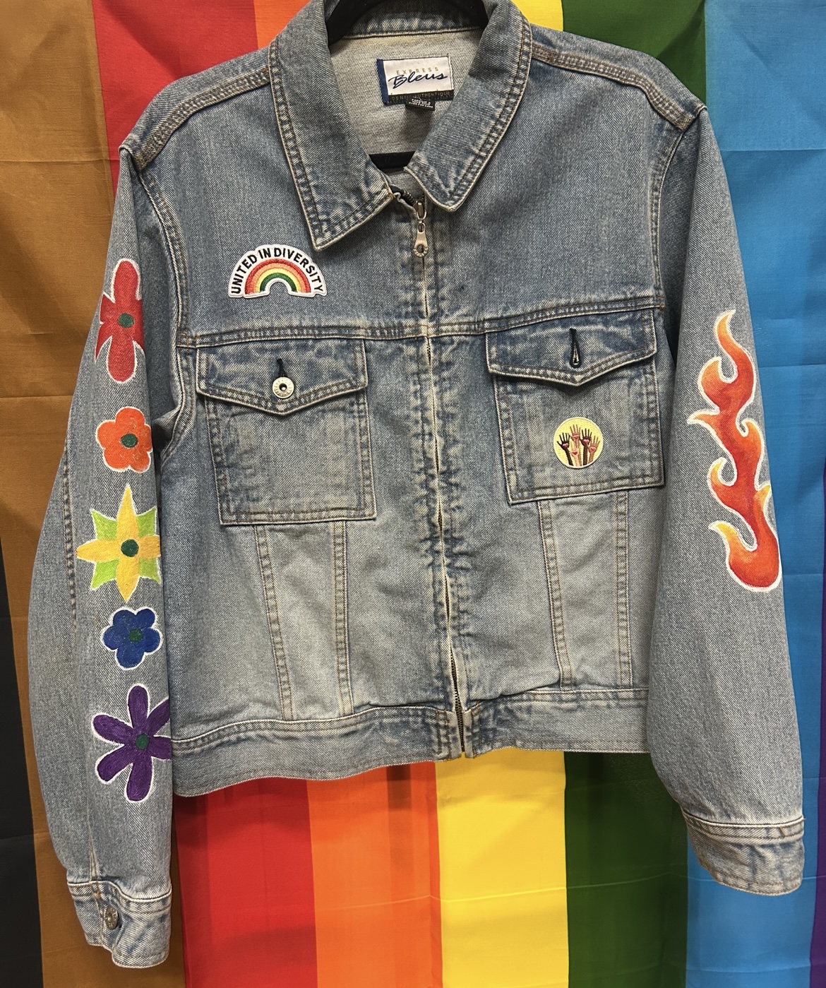 Vintage Express denim jacket featuring Unity & Diversity patches on front and flames and rainbow flowers hand painted on back and sleeves with the words "Rise & Resist" across the back